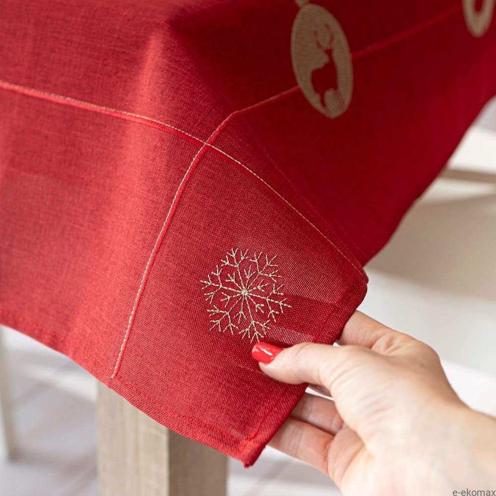 Elegancki bieżnik świąteczny 40x140 cm to wyjątkowy element dekoracyjny, który doda blasku Twojemu stołowi w czasie Bożego Narodzenia. Utrzymany w głębokiej czerwieni, ozdobiony został złotym haftem w formie reniferów i śnieżynek, które subtelnie połyskują i tworzą niezwykle efektowną aranżację. To połączenie klasyki i nowoczesnej elegancji, które doskonale sprawdzi się podczas świątecznych spotkań.