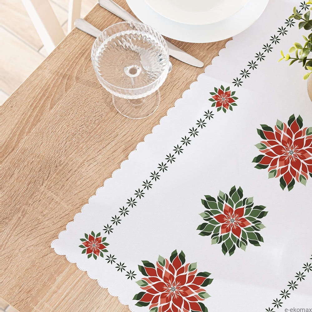 Dodaj swojemu stołowi wyjątkowego, świątecznego charakteru dzięki bieżnikowi 50x100 cm z motywem gwiazdy betlejemskiej w folkowym wydaniu. Stylizowany kwiat w odcieniach czerwieni i zieleni, otoczony dekoracyjnym obramowaniem, przyciąga uwagę i wprowadza ciepłą, tradycyjną atmosferę do wnętrza. Idealny na świąteczne śniadania, wigilijną kolację, a także zimowe spotkania z bliskimi.