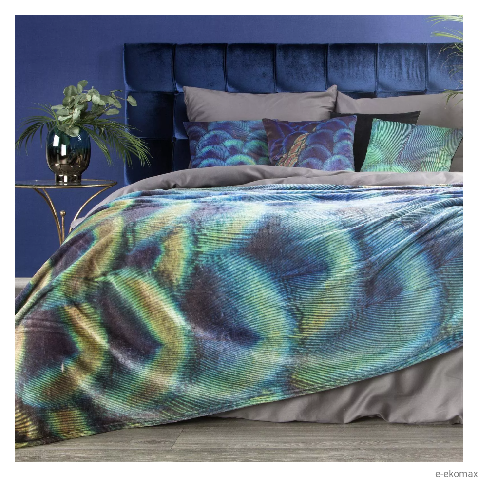Największym wyróżnikiem tego modelu jest efektowny nadruk w stylu pawiego oka, utrzymany w intensywnych, szlachetnych barwach: błękitach, zieleni, czerni i złocie. Kolorystyka oraz wzornictwo sprawiają, że koc idealnie komponuje się z aranżacjami w stylu glamour, nowoczesnym, a także eklektycznym, stając się centralnym punktem dekoracyjnym wnętrza.