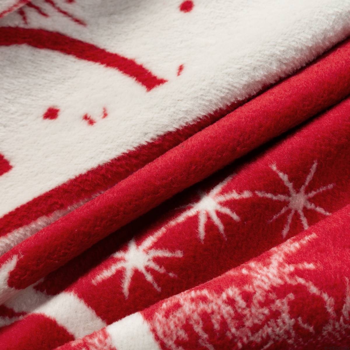Wyjątkowość tego koca tkwi nie tylko w jego funkcjonalności, ale również w estetyce. Śnieżnobiały materiał ozdobiony jest subtelnymi, czerwonymi wzorami w postaci świątecznych motywów, takich jak śnieżynki, co tworzy harmonijną i elegancką kompozycję. Koc ten z pewnością stanie się centralnym punktem dekoracyjnym w Twoim domu podczas świąt, dodając wnętrzu ciepła i wyjątkowego uroku.