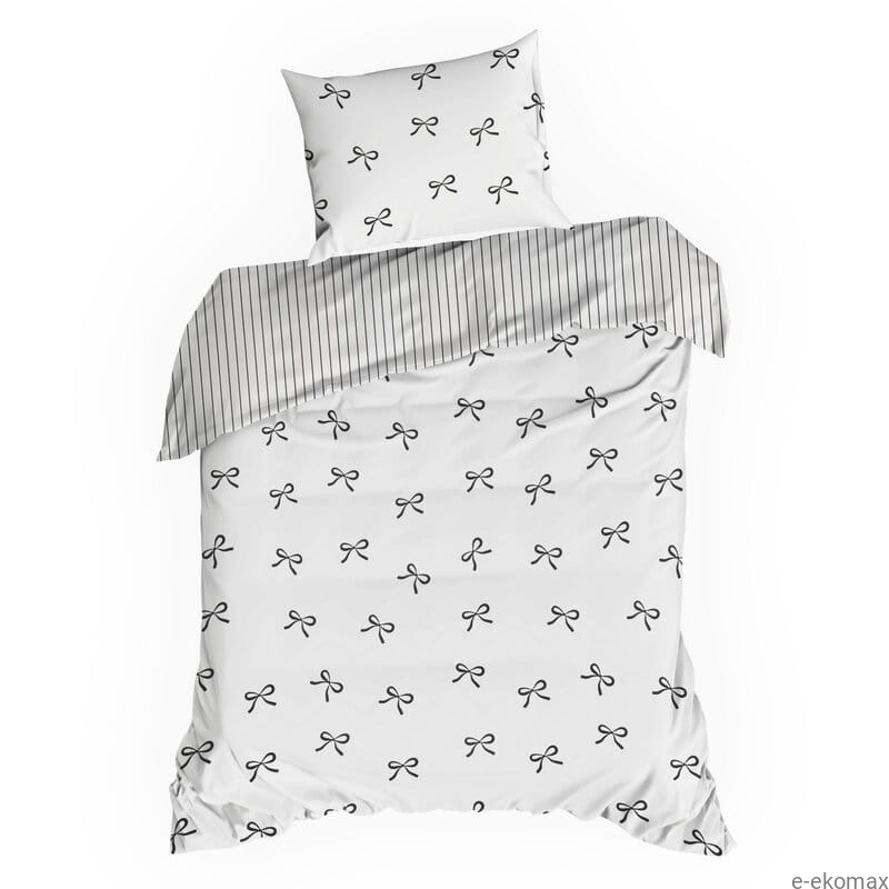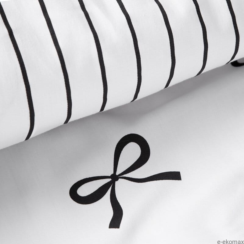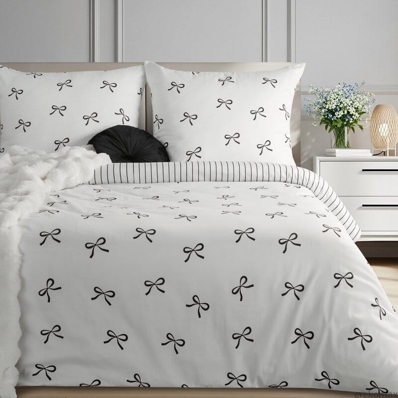 Komplet pościeli 140x200 z uroczym motywem czarnych kokardek to stylowa propozycja do jasnej, nowoczesnej sypialni. Na białym tle rozmieszczono drobne, minimalistyczne kokardki, które tworzą lekki i elegancki wzór. Całość dopełnia druga strona pościeli z subtelnym motywem cienkich czarnych pasków, dzięki czemu komplet prezentuje się modnie i bardzo dekoracyjnie.