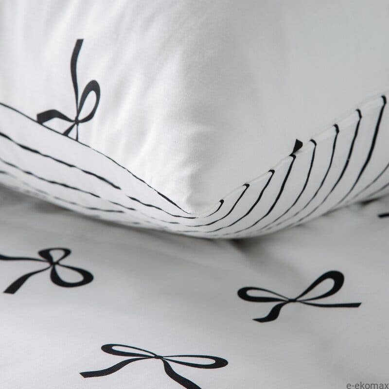 Kontrastowe połączenie bieli i czerni nadaje pościeli ponadczasowego charakteru. Wzór doskonale wpisuje się w aranżacje skandynawskie, minimalistyczne oraz nowoczesne, a także świetnie sprawdzi się w pokoju młodzieżowym lub kobiecej sypialni. Delikatny motyw kokardek dodaje wnętrzu lekkości i subtelnej elegancji.
