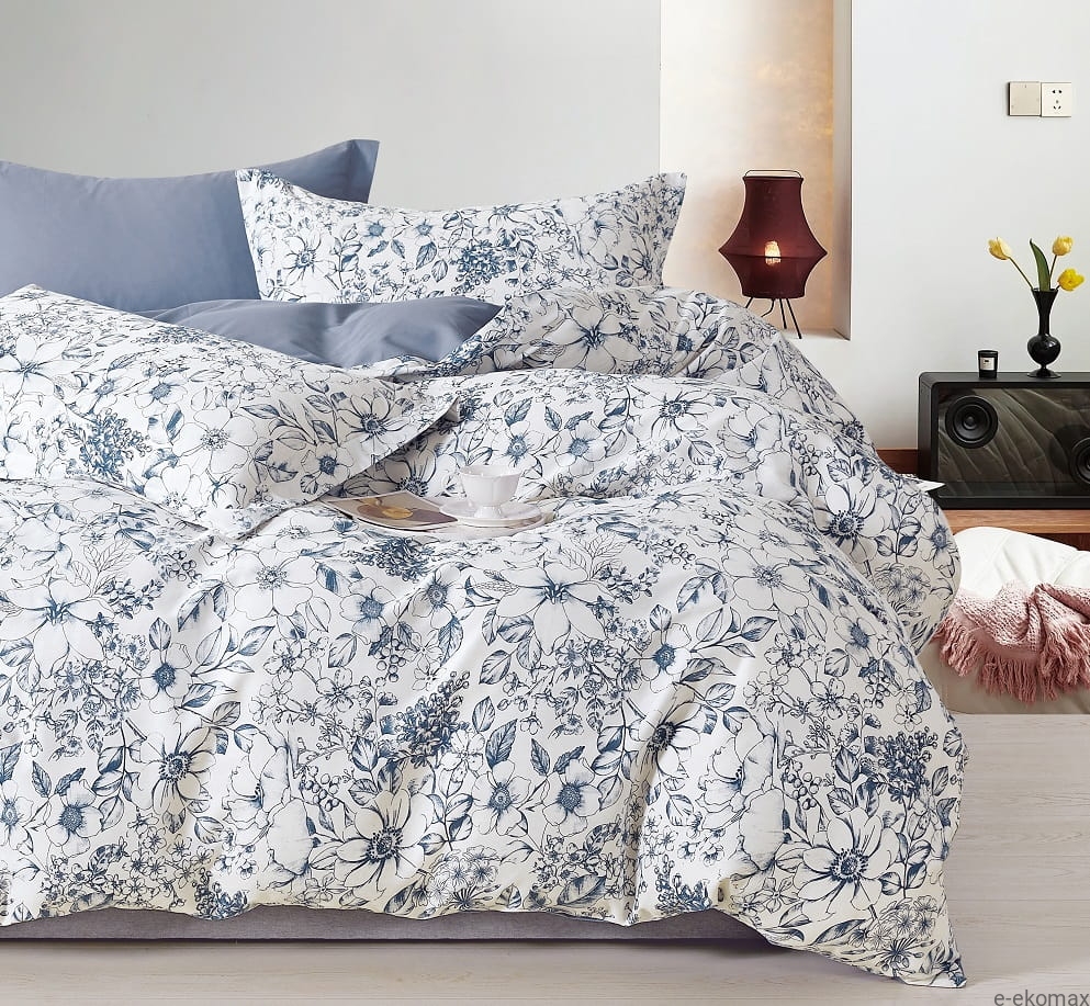 Wykonana z satynowej bawełny, pościel zachwyca swoją gładkością, miękkością i odpornością na codzienne użytkowanie. Naturalna tkanina zapewnia doskonałą cyrkulację powietrza, dzięki czemu pościel sprawdza się przez cały rok – zarówno latem, jak i zimą. Z jednej strony widoczny jest szczegółowy kwiatowy wzór na jasnym tle, z drugiej stonowany, gładki błękit – ta dwustronność sprawia, że jednym ruchem możesz odmienić charakter łóżka.