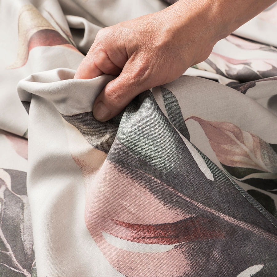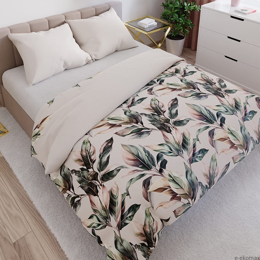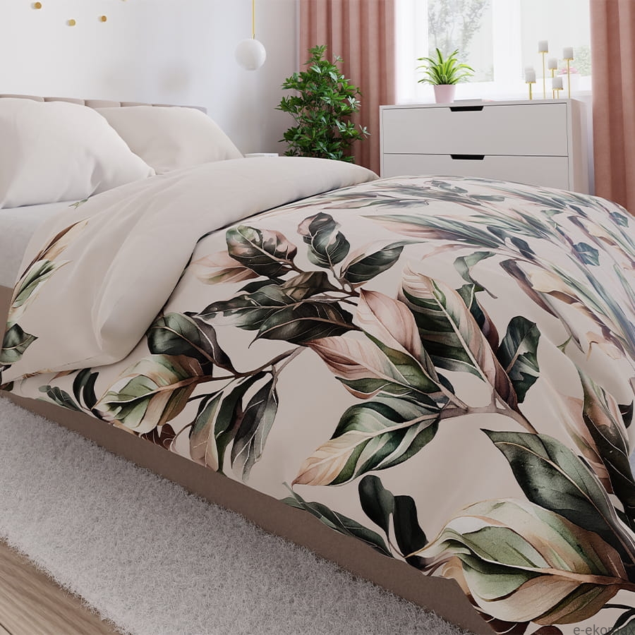Komplet pościeli w rozmiarze 160x200 zachwyca subtelnym, tropikalnym wzorem – duże, malarskie liście w odcieniach zieleni, brązu i pudrowego różu rozłożone są na jasnym, kremowym tle, tworząc efekt głębi i naturalnego ruchu. Delikatnie cieniowane barwy i akwarelowy styl nadruku sprawiają, że pościel wygląda lekko, nowocześnie i bardzo stylowo.