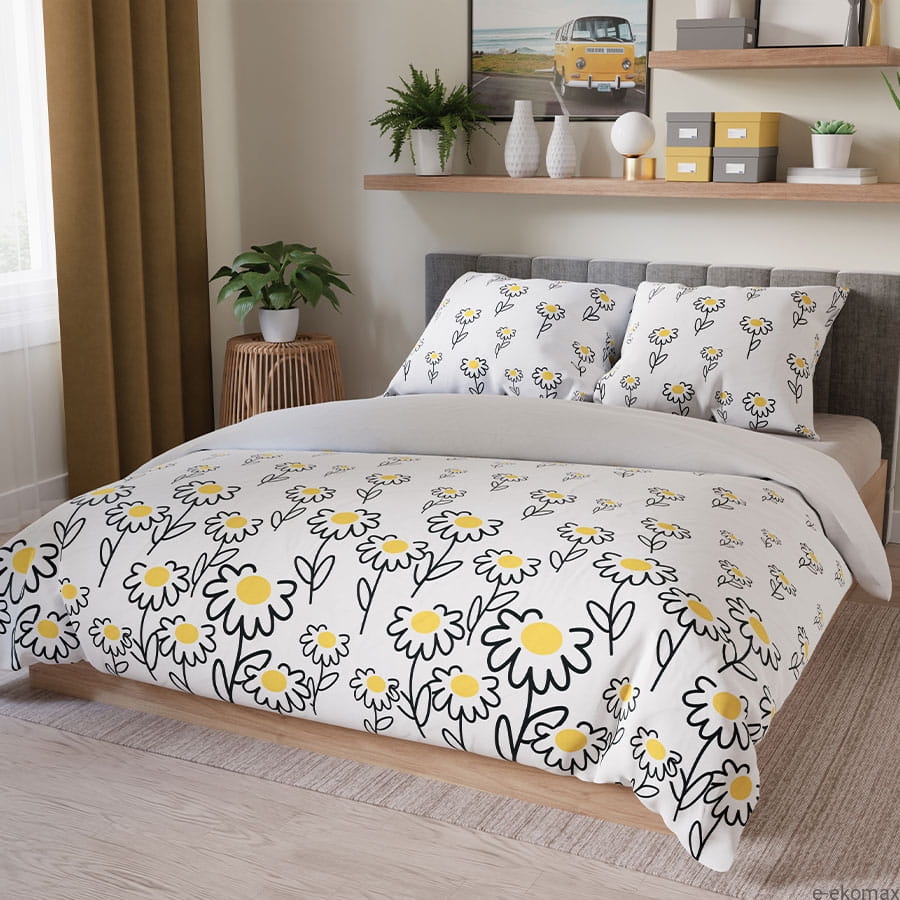Wzór przedstawiający subtelne kwiaty w odcieniach bieli i żółci dodaje kompletowi pościeli uroku i świeżości. Minimalistyczny, lecz urokliwy design sprawia, że pościel będzie pasować zarówno do nowoczesnych, jak i klasycznych wnętrz, wprowadzając lekkość i naturalny akcent. Komplet pościeli zawiera poszwę o wymiarach 220x200 oraz dwie poszewki na poduszki 70x80, co stanowi idealne rozwiązanie dla standardowego łóżka dwuosobowego.