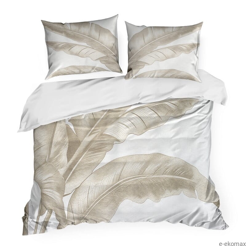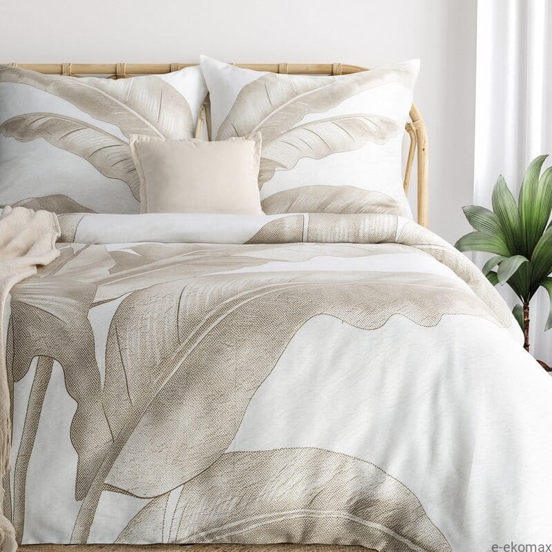 Komplet pościeli 220x200 z dużym, dekoracyjnym motywem liści to elegancka propozycja do przestronnej sypialni. Na jasnym tle widoczne są subtelnie cieniowane liście w odcieniach beżu i piaskowego brązu, które tworzą spokojną, harmonijną kompozycję inspirowaną naturą. Delikatna kolorystyka sprawia, że pościel prezentuje się bardzo stylowo i wprowadza do wnętrza atmosferę relaksu.