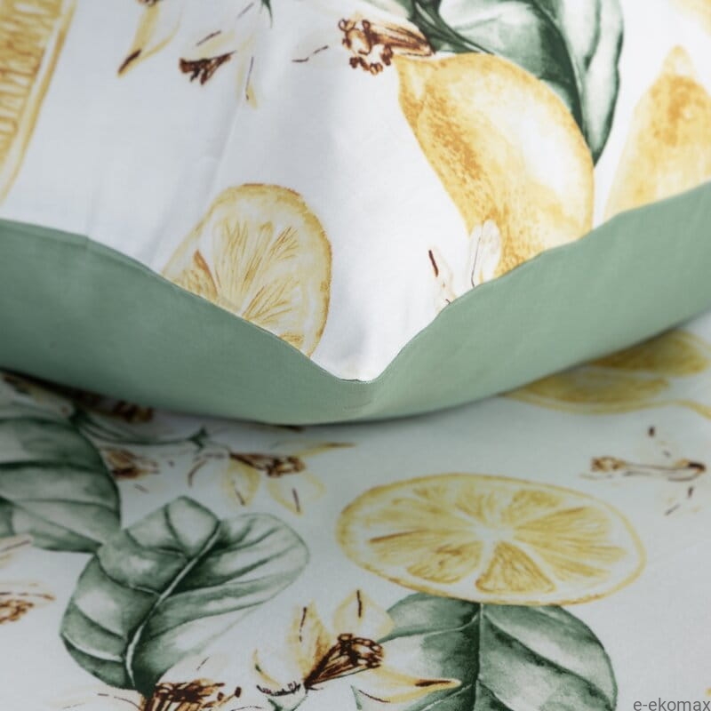 Dekoracyjny wzór z soczystymi cytrynami, zielonymi liśćmi oraz delikatnymi kwiatami na jasnym tle nadaje pościeli radosny, a jednocześnie harmonijny charakter. Jednolity, zielony spód tworzy spójną całość i podkreśla naturalną kolorystykę wzoru. Pościel doskonale sprawdzi się w aranżacjach nowoczesnych, boho oraz inspirowanych stylem śródziemnomorskim.