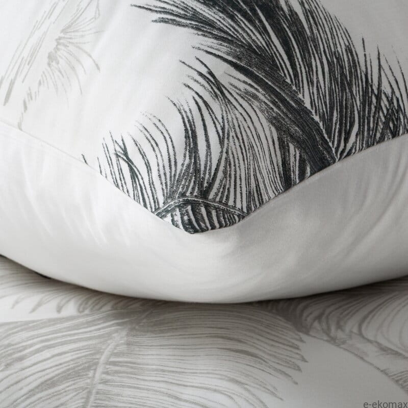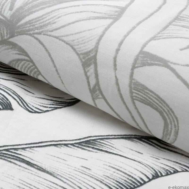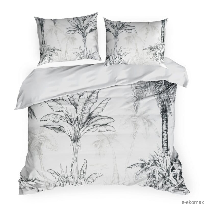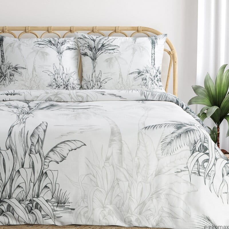 Komplet pościeli 220x200 z subtelnym motywem tropikalnej roślinności to stylowa propozycja do nowoczesnej sypialni. Na jasnym tle widoczna jest delikatna ilustracja palm, dużych liści oraz egzotycznych roślin wykonana w eleganckiej czarno-szarej kolorystyce. Artystyczny rysunek przypomina szkic wykonany cienką kreską, dzięki czemu wzór prezentuje się lekko, a jednocześnie bardzo dekoracyjnie.