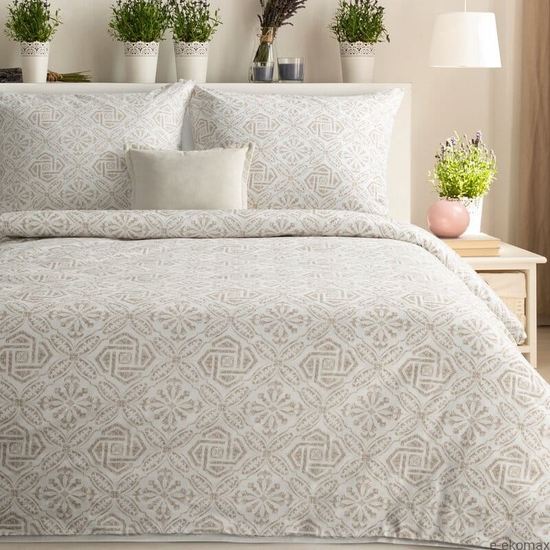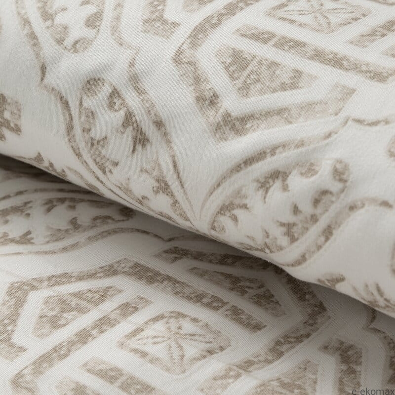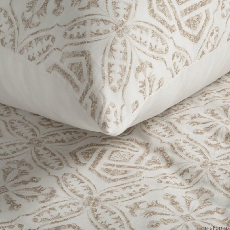Komplet pościeli 220x200 w subtelny, beżowy ornament to idealna propozycja na duże łóżko małżeńskie, gdzie liczy się zarówno komfort, jak i elegancki wygląd. Jasna baza w odcieniu ciepłej bieli została ozdobiona delikatnym, symetrycznym wzorem inspirowanym klasycznymi motywami dekoracyjnymi. Całość prezentuje się lekko, harmonijnie i ponadczasowo, doskonale wpisując się w aranżacje w stylu klasycznym, soft glamour, boho oraz naturalnym.