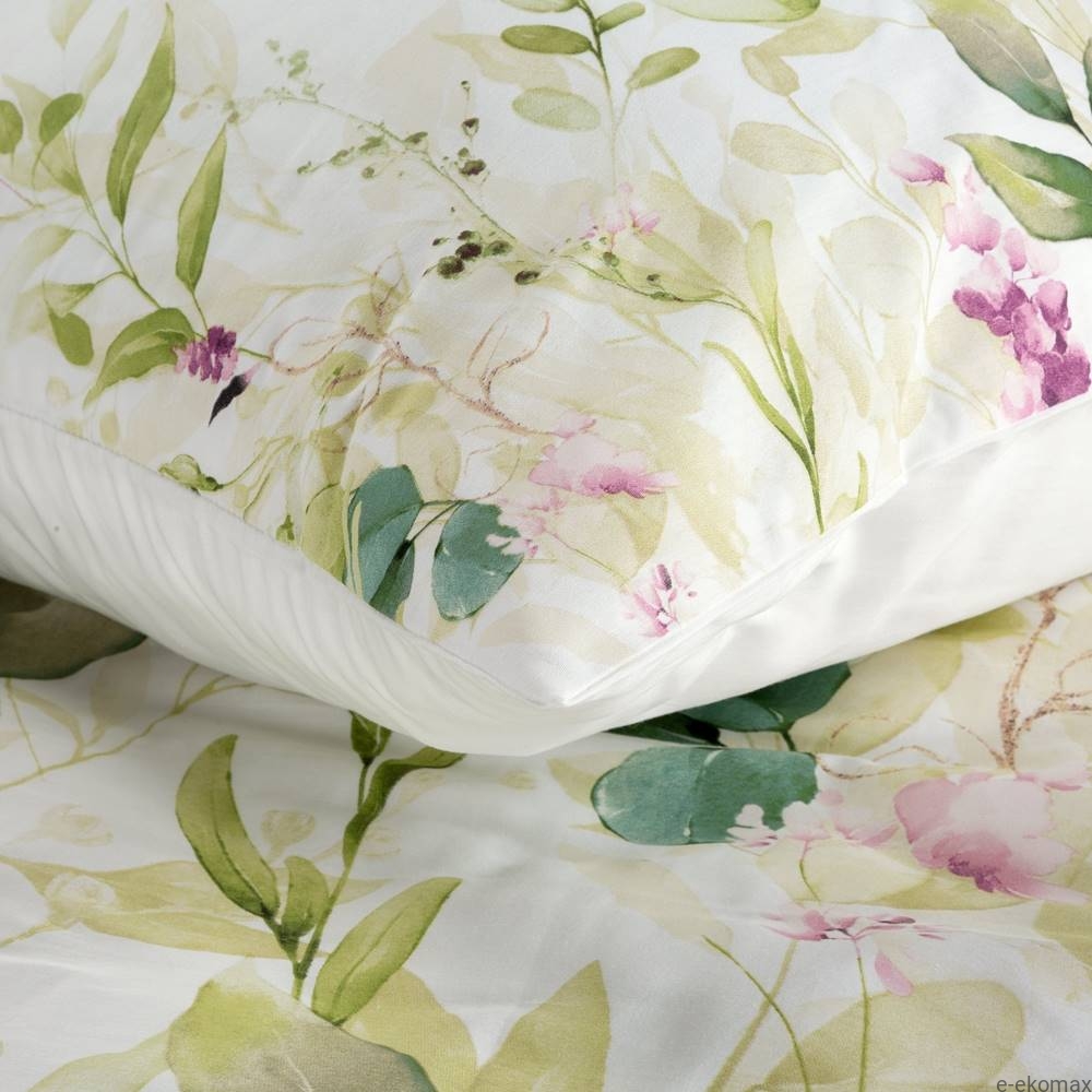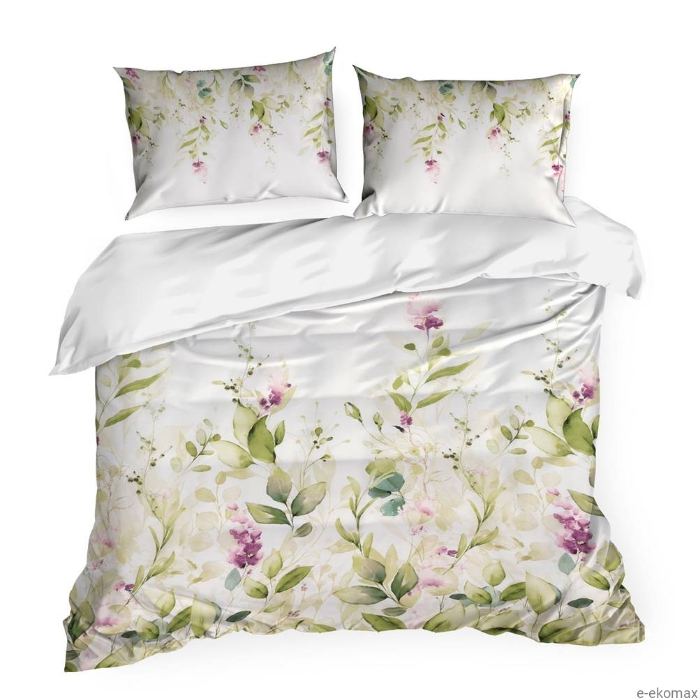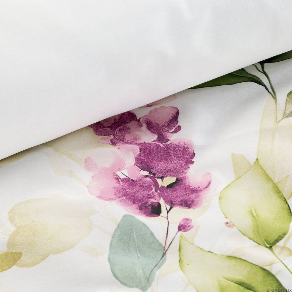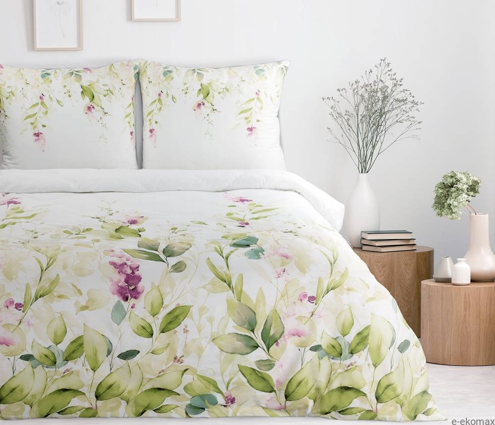 Pościel z bawełny satynowej 220x200 Nika to elegancki i funkcjonalny zestaw, który łączy w sobie estetykę i wysoką jakość wykonania. Główna część pościeli jest ozdobiona wzorem pięknych zielonych liści z drobnymi fioletowymi kwiatami na białym tle, co nadaje jej delikatny i romantyczny wygląd. Spodnia część pościeli jest w całości biała, co podkreśla jej prostotę i klasyczny styl.