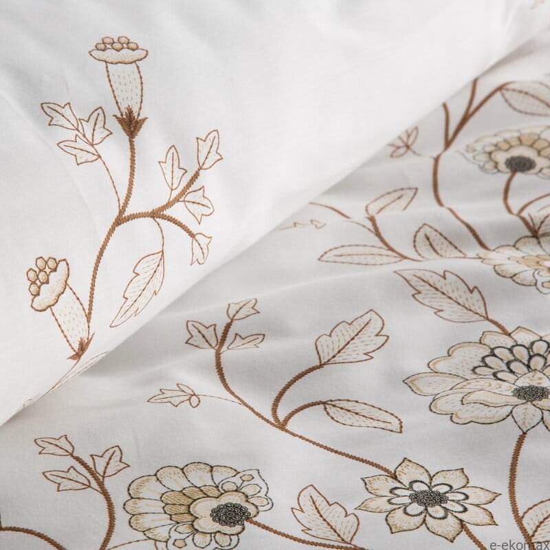 Design pościeli to połączenie klasyki z nowoczesnym minimalizmem. Białe tło zdobi delikatny, kwiatowy wzór w odcieniach beżu i brązu, który przypomina ręcznie rysowane ornamenty inspirowane naturą. Finezyjnie wijące się gałązki oraz stylizowane kwiaty tworzą subtelną, ale jednocześnie wyrazistą dekorację, która doskonale komponuje się zarówno z eleganckimi wnętrzami, jak i bardziej nowoczesnymi aranżacjami.
