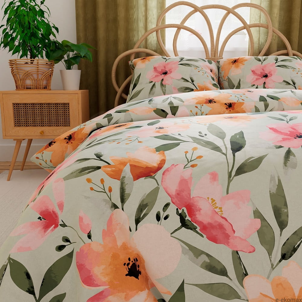 Wyjątkowy wzór w intensywnych barwach to prawdziwa ozdoba sypialni. Duże kwiaty w odcieniach różu, pomarańczu i zieleni prezentują się niczym akwarelowe malowidło, wprowadzając do wnętrza świeżość, energię i pozytywną atmosferę. To doskonały wybór dla osób, które lubią odważne i stylowe akcenty w aranżacji wnętrz.