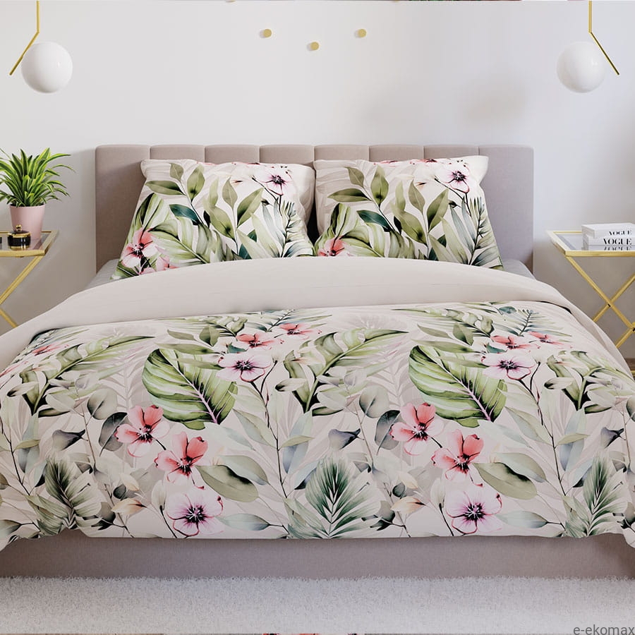 Zachwycający motyw botaniczny, złożony z bujnych zielonych liści oraz różowych kwiatów hibiskusa, wprowadza do wnętrza odrobinę egzotyki i świeżości. Zestaw zawiera poszwę na kołdrę o wymiarach 220x200 oraz dwie poszewki na poduszki o wymiarach 70x80, co czyni go idealnym wyborem dla osób ceniących sobie wygodę i styl. Zamknięcie na zamek błyskawiczny zapewnia łatwe i szybkie zakładanie pościeli, a także jej idealne dopasowanie.