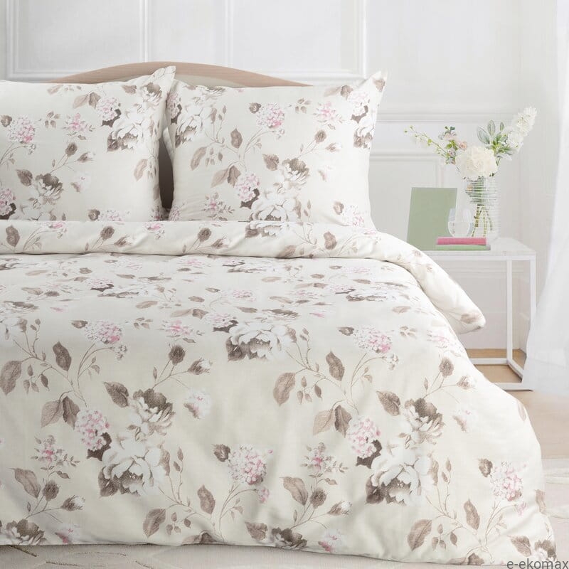 Jej design to połączenie romantycznego wzoru kwiatowego w pastelowych odcieniach różu, beżu i brązu, umieszczonego na jasnym tle. Ręcznie malowany efekt wzoru dodaje pościeli subtelności i artystycznego charakteru, a harmonijna kolorystyka wprowadza do wnętrza spokój i przytulność. Dzięki temu doskonale komponuje się z wnętrzami w stylu klasycznym, shabby chic czy skandynawskim.