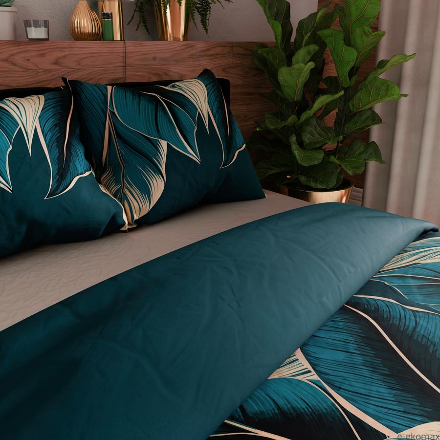 Komplet pościeli bawełnianej 160x200 – tropikalne liście w głębokim turkusie