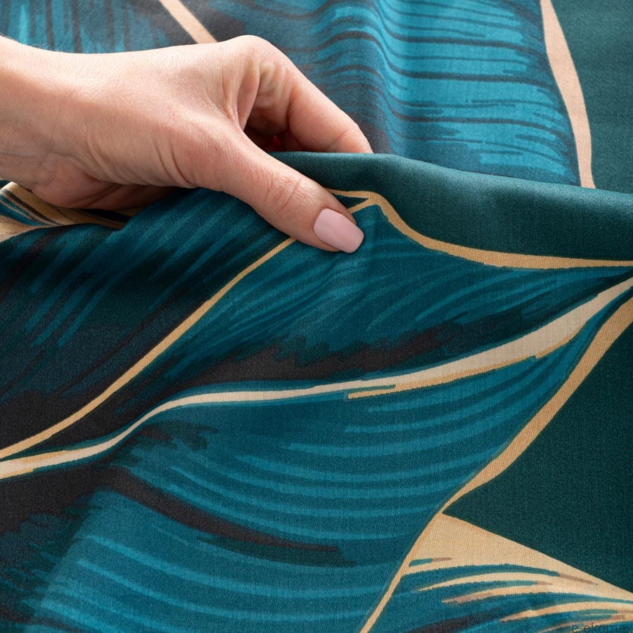 Wprowadź do swojej sypialni powiew egzotyki z kompletem pościeli w nowoczesny, roślinny wzór. Duże, dynamiczne liście w odcieniach turkusu, beżu i czerni przyciągają wzrok i nadają wnętrzu świeżości oraz wyrazistego charakteru. To propozycja dla osób, które cenią odważny design inspirowany naturą.