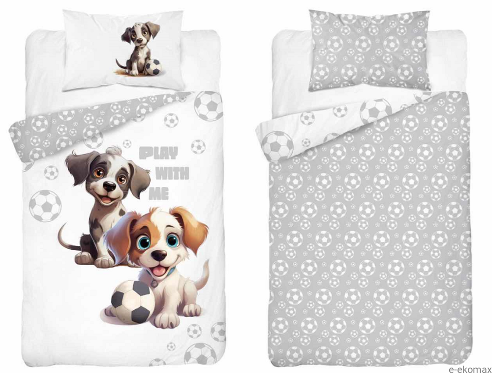 Urocza pościel dziecięca z motywem wesołych piesków i piłek to idealna propozycja dla małych miłośników zwierząt i sportowych przygód. Centralna grafika przedstawia sympatyczne szczeniaki bawiące się piłką nożną, które wprowadzają do pokoju radosny i przyjazny klimat. Stonowana, biało-popielata kolorystyka z delikatnym wzorem piłek na drugiej stronie sprawia, że pościel jest uniwersalna i łatwo dopasowuje się do różnych aranżacji dziecięcej sypialni. Dwustronne wykonanie pozwala szybko odmienić wygląd łóżka.