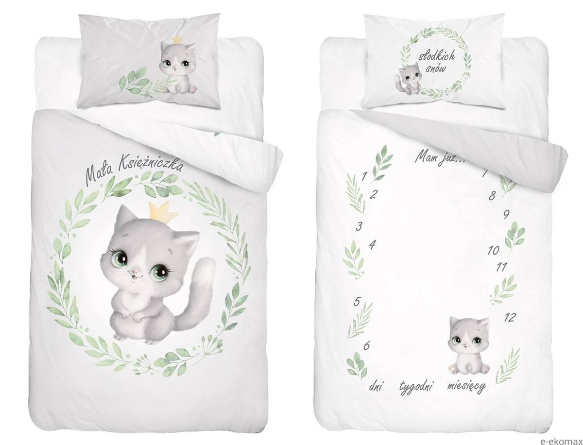 Wprowadź do dziecięcej sypialni nutkę elegancji i uroku z pościelą „Mała Księżniczka”. Komplet o wymiarach 100x135 cm (poszwa na kołdrę) oraz 40x50 cm (poszewka na poduszkę) ozdobiony jest subtelną ilustracją szarej kotki z koroną w otoczeniu liściastego wieńca. Z jednej strony pościeli widnieje uroczy napis „Mała Księżniczka”, z drugiej – praktyczna grafika do zdjęć z oznaczeniami wieku: dni, tygodnie, miesiące.