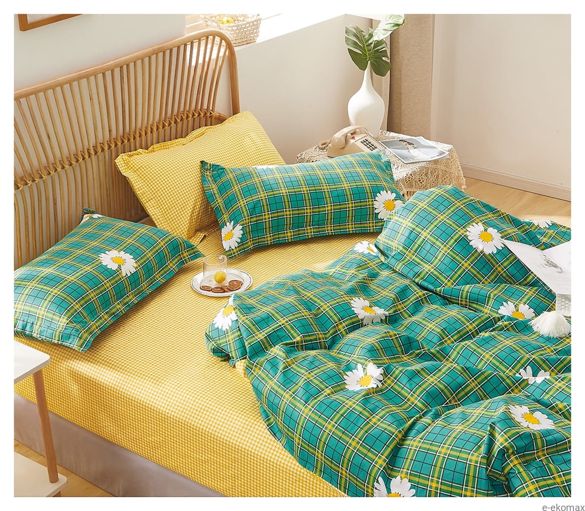 Komplet pościeli dwustronnej w kratkę 160x200 w stokrotki