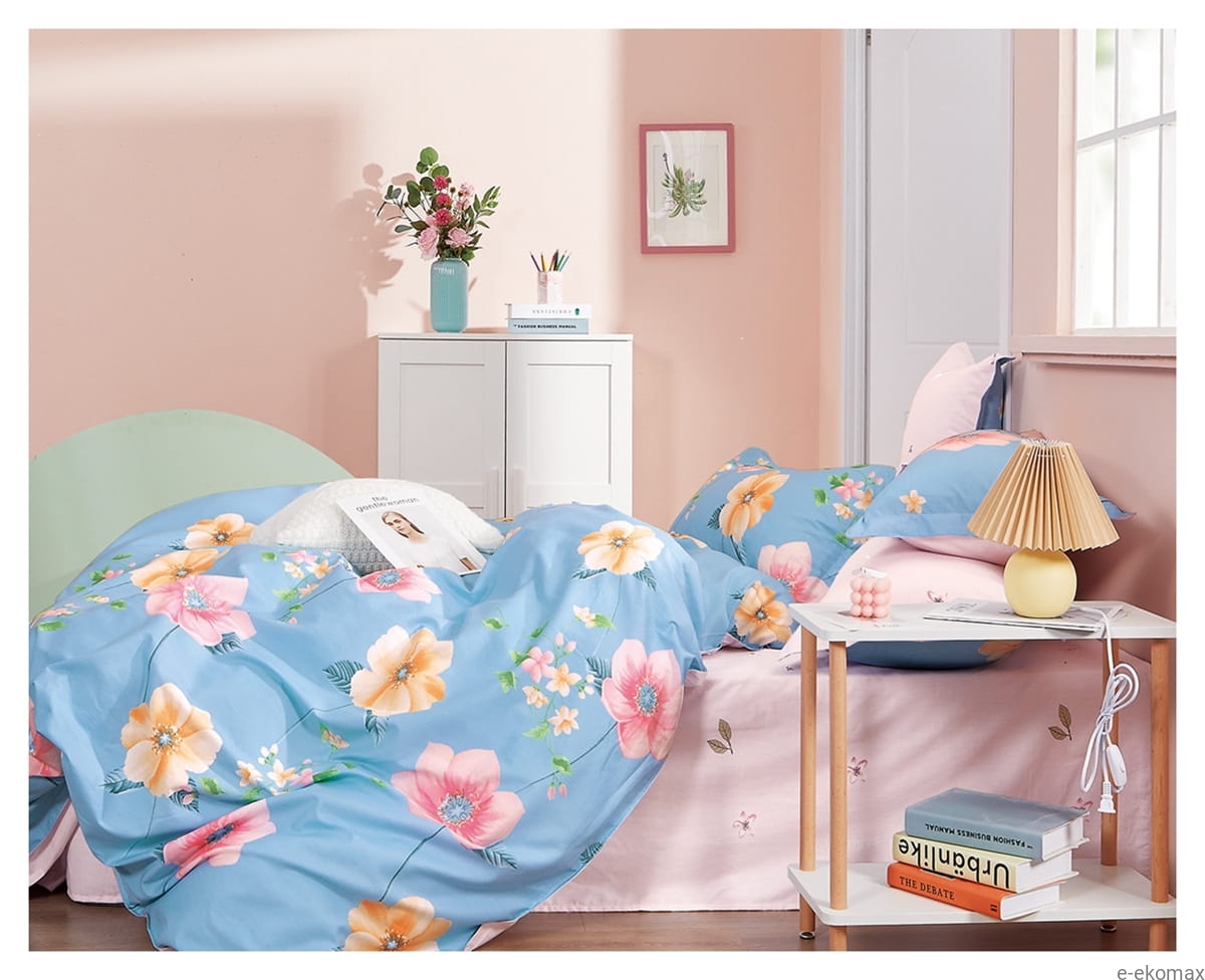 Ten komplet pościeli 160x200 to wyjątkowe połączenie romantycznego stylu, subtelnych kolorów i wygody codziennego użytkowania. Wierzchnia strona pościeli zachwyca błękitnym tłem ozdobionym dużymi, pastelowymi kwiatami w odcieniach różu, żółci i brzoskwini. Wzór ten nadaje wnętrzu świeżości i lekkości, wprowadzając przyjemną, wiosenną atmosferę. Spodnia strona, utrzymana w pudrowo-różowym tonie, zdobiona jest delikatnym motywem drobnych motyli, który stanowi harmonijne i spokojne dopełnienie całości. Obie strony pościeli współgrają ze sobą, pozwalając na łatwą zmianę aranżacji sypialni.