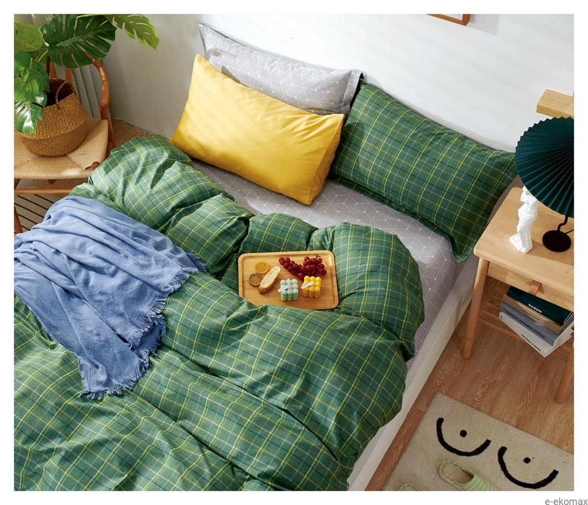 Nie każda pościel musi krzyczeć kolorem, żeby przyciągać uwagę. Ten komplet 160x200 udowadnia, że klasyka w nowoczesnym wydaniu może być równie efektowna. Głęboka zieleń przełamana delikatną żółtą kratką tworzy harmonijny, spokojny wzór, który wprowadza do sypialni poczucie ładu i przytulności. Zestaw świetnie odnajduje się w naturalnych aranżacjach, pasując zarówno do jasnych, jak i ciemniejszych dodatków.