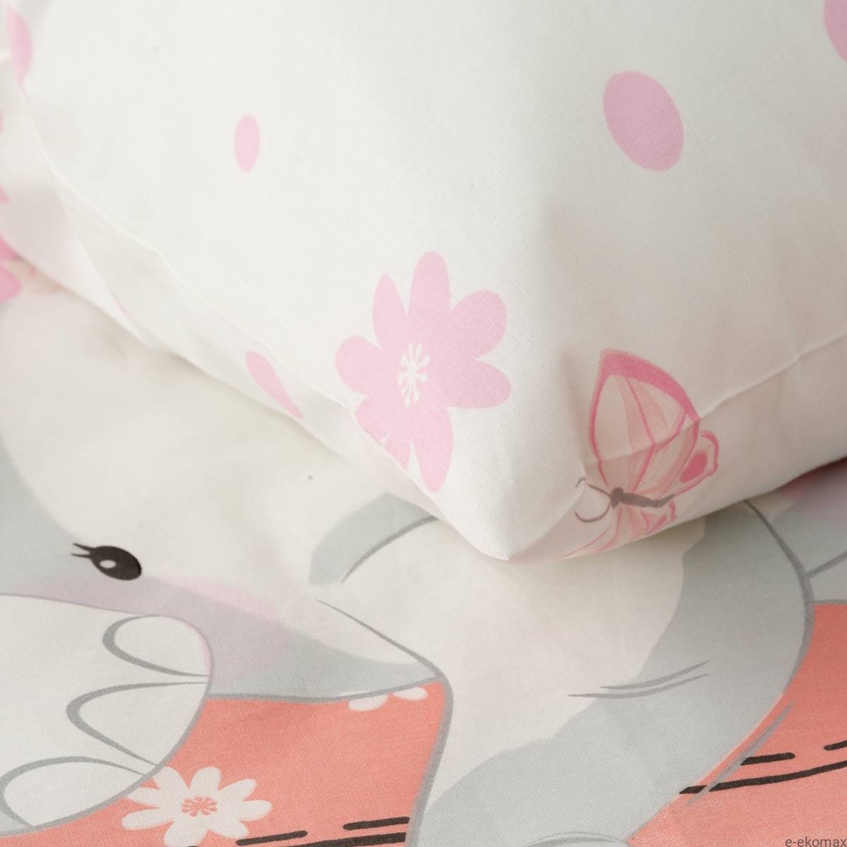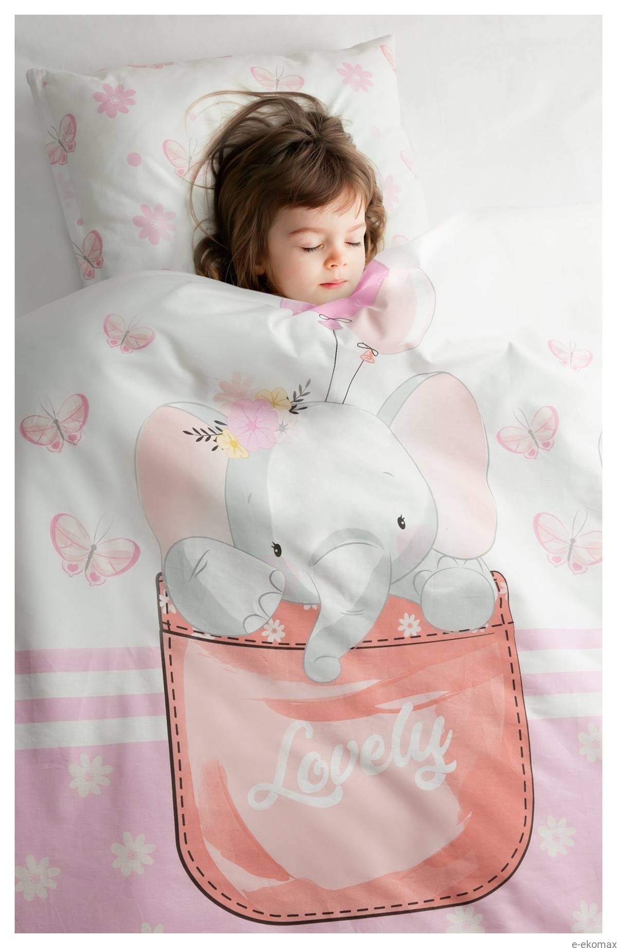 Stwórz bajkową przestrzeń do snu dla swojej małej księżniczki dzięki pościeli z uroczym słonikiem w pastelowych odcieniach różu i szarości. Komplet o wymiarach 100x135 zawiera poszewkę na kołdrę oraz poduszkę 40x50 cm. Centralny motyw przedstawia słonika wychylającego się z kieszonki z napisem „Lovely”, otoczonego motylkami i balonami — całość tworzy ciepły i przytulny klimat.