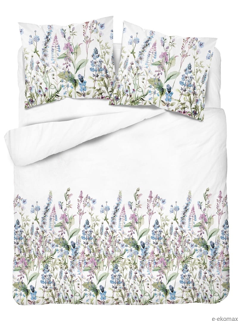 Pozwól, by Twoja sypialnia rozkwitła o każdej porze roku. Pościel z satyny bawełnianej w rozmiarze 220x200 cm to wyjątkowy projekt inspirowany dziką łąką, malowany akwarelą w tonacjach błękitu, lawendy, różu i zieleni. Subtelny nadruk rozwija się od dołu pościeli, niczym roślinność wyrastająca ku światłu – smukłe łodygi, drobne płatki i delikatne liście tworzą malowniczą granicę, która otula łóżko naturalnym rytmem letniego poranka.