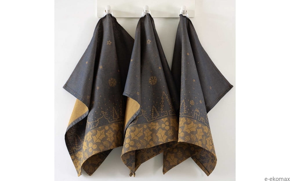 Ściereczki urzekają klasycznym połączeniem głębokiego granatu i ciepłego złota, tworząc efektowny wzór z motywami bożonarodzeniowymi – choinkami, gwiazdkami i reniferami. Dzięki stonowanej, ale wyrazistej kolorystyce będą pięknym i funkcjonalnym dodatkiem do każdej kuchni w okresie świątecznym.