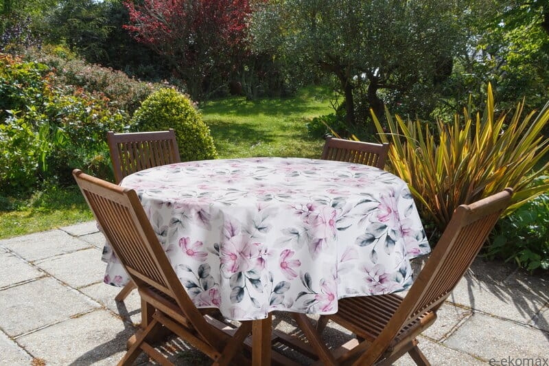 Obrus wodoodporny okrągły 150cm do ogrodu - różowe kwiaty