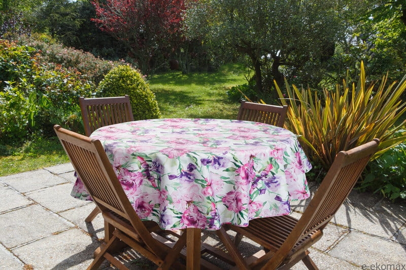 Obrus ogrodowy o średnicy 150 cm wykonany z wysokiej jakości tkaniny wodoodpornej to idealne rozwiązanie na letnie dni spędzane na tarasie lub w ogrodzie. Intensywny, kwiatowy wzór w odcieniach różu, fioletu i zieleni dodaje przestrzeni świeżości i koloru. Gramatura materiału 150 g/m² zapewnia trwałość, a odporność na wilgoć sprawia, że obrus świetnie sprawdza się nawet przy zmiennej pogodzie.