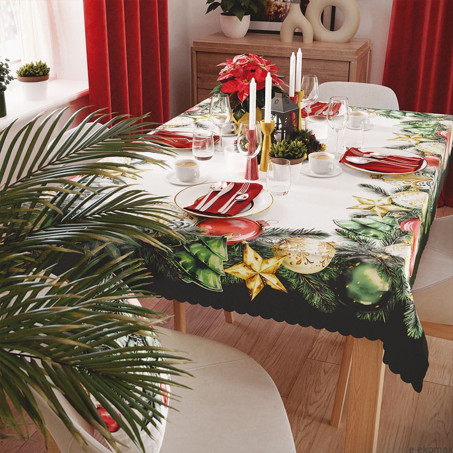 Świąteczny obrus o wymiarach 140x220 to idealny element dekoracyjny, który wprowadzi do Twojego domu wyjątkowy, bożonarodzeniowy klimat. Wykonany z wysokiej jakości materiału, obrus zachwyca pięknym wzorem bombek, gałązek igliwia oraz gwiazd, które subtelnie zdobią jego brzegi. Elegancka kompozycja kolorów w odcieniach złota, zieleni i czerwieni doskonale wpisuje się w świąteczną estetykę, nadając stołowi uroczysty i przytulny charakter.