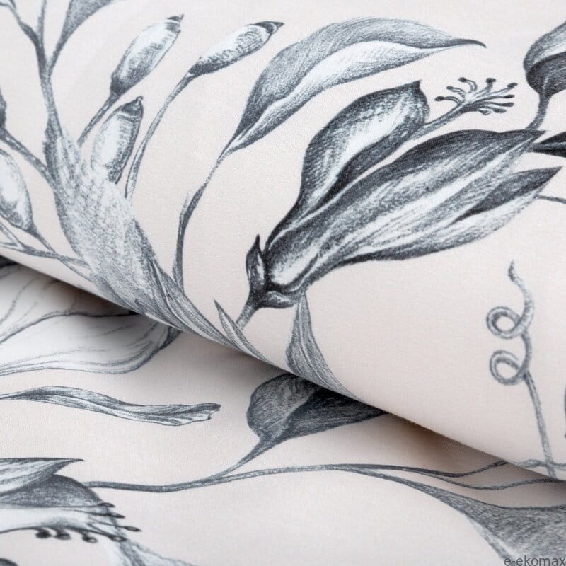 Pościel makosatyna 220x200 z delikatnym, kwiatowym wzorem to idealna propozycja do większych łóżek, gdzie liczy się zarówno komfort, jak i elegancki wygląd sypialni. Jasne, kremowo tło zostało ozdobione subtelnym motywem roślinnym w odcieniach szarości, który nadaje wnętrzu spokojny, harmonijny charakter i wprowadza nutę ponadczasowej klasyki.