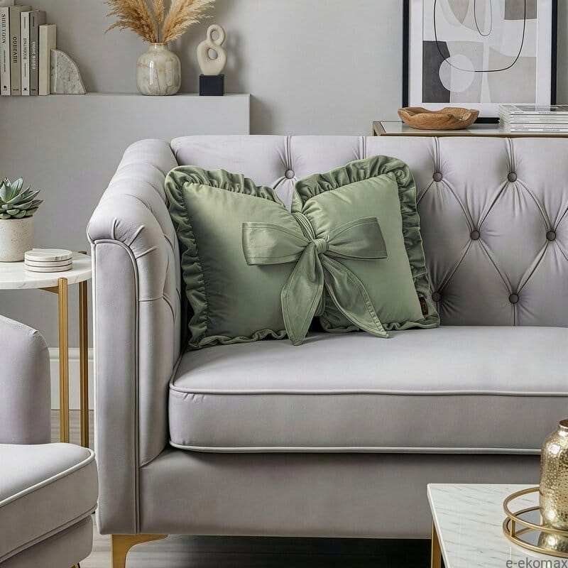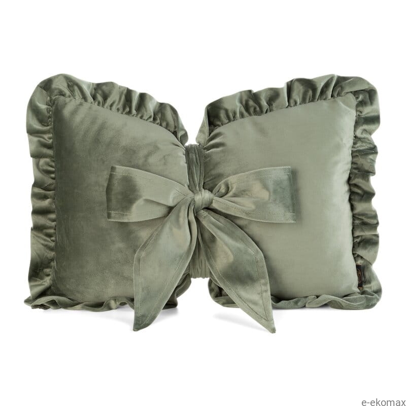 Poduszka dekoracyjna z kokardą w kolorze oliwkowym to stylowy dodatek, który wprowadza do wnętrza naturalną elegancję i spokojny, harmonijny klimat. Wykonana z miękkiego welwetu, przyjemnego w dotyku i delikatnie połyskującego, prezentuje się wyjątkowo estetycznie i przytulnie. Ozdobna kokarda na froncie oraz falbana obszywająca krawędzie nadają całości dekoracyjny, lekko romantyczny charakter.