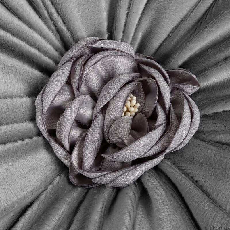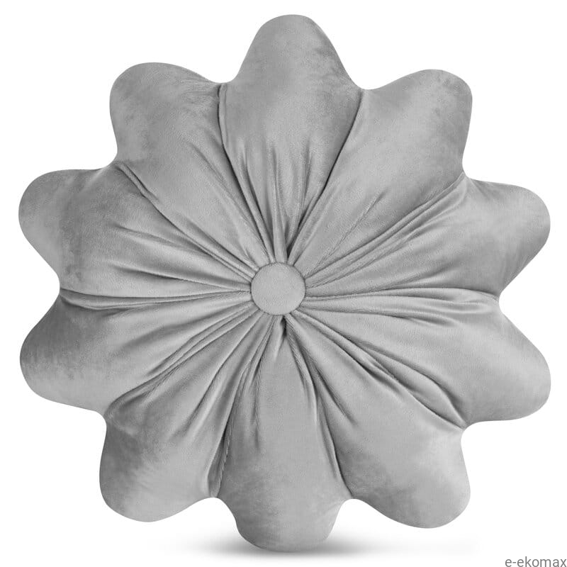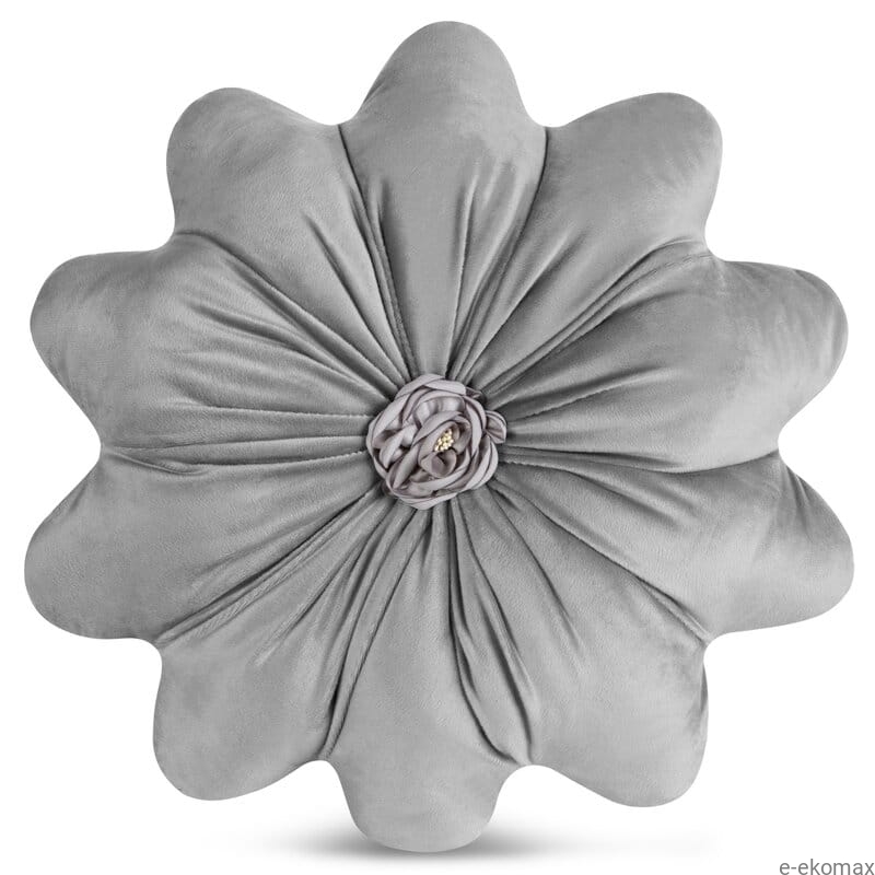 Welwetowa poduszka dekoracyjna w kształcie kwiatu o średnicy 40 cm w srebrnym kolorze to elegancki i wyrazisty dodatek do wnętrza. Jej przestrzenna forma z miękko ułożonymi płatkami oraz dekoracyjnym środkiem tworzy efekt trójwymiarowego, rozkwitającego kwiatu, który przyciąga uwagę i nadaje aranżacji wyjątkowego charakteru.