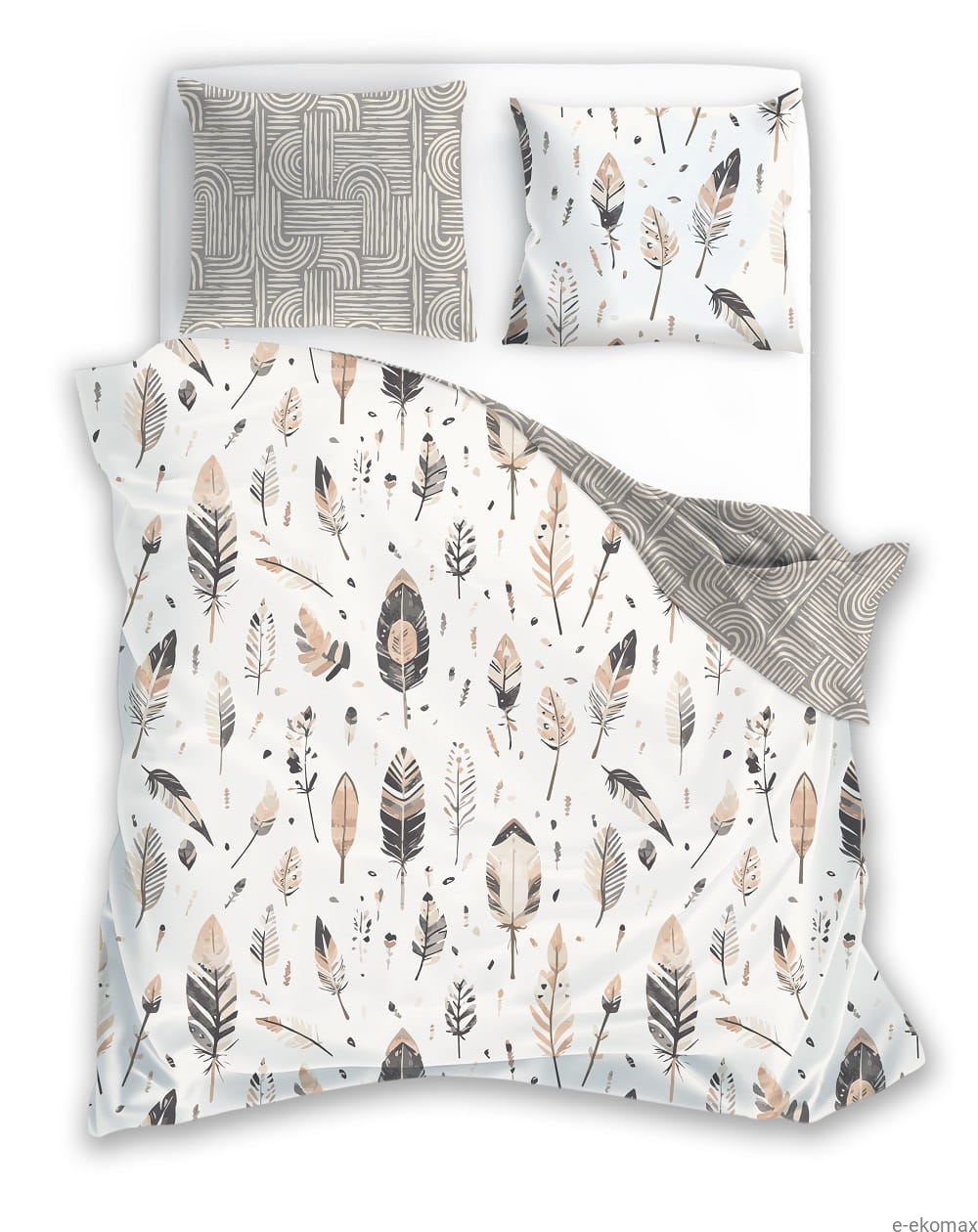 Pościel posiada dwustronny design – z jednej strony dekoracyjny motyw piór, z drugiej geometryczny wzór w odcieniach szarości, który pozwala łatwo zmienić charakter aranżacji sypialni. Zastosowane zamki błyskawiczne w poszwie na kołdrę oraz poszewkach na poduszki zapewniają wygodę użytkowania i estetyczne wykończenie.