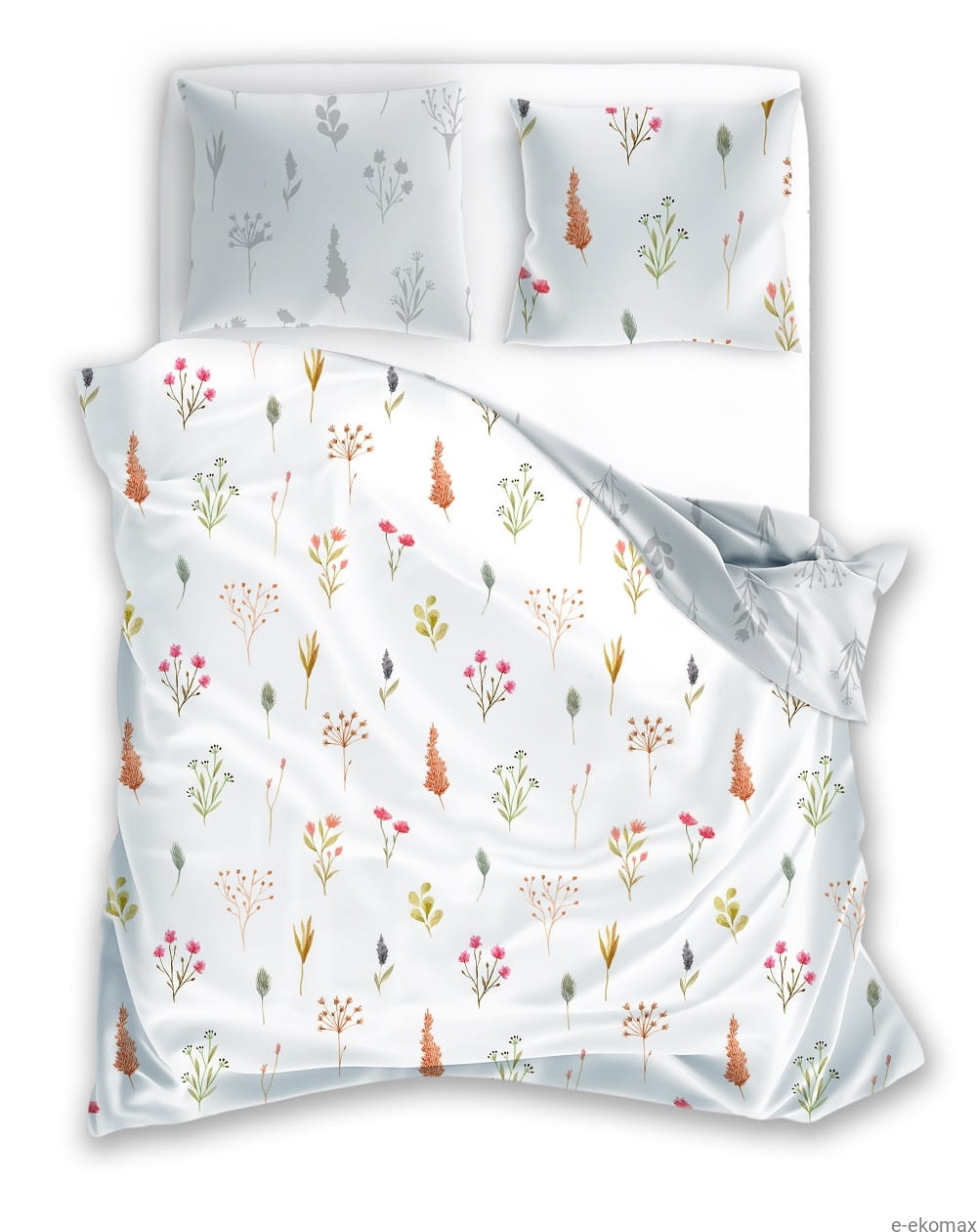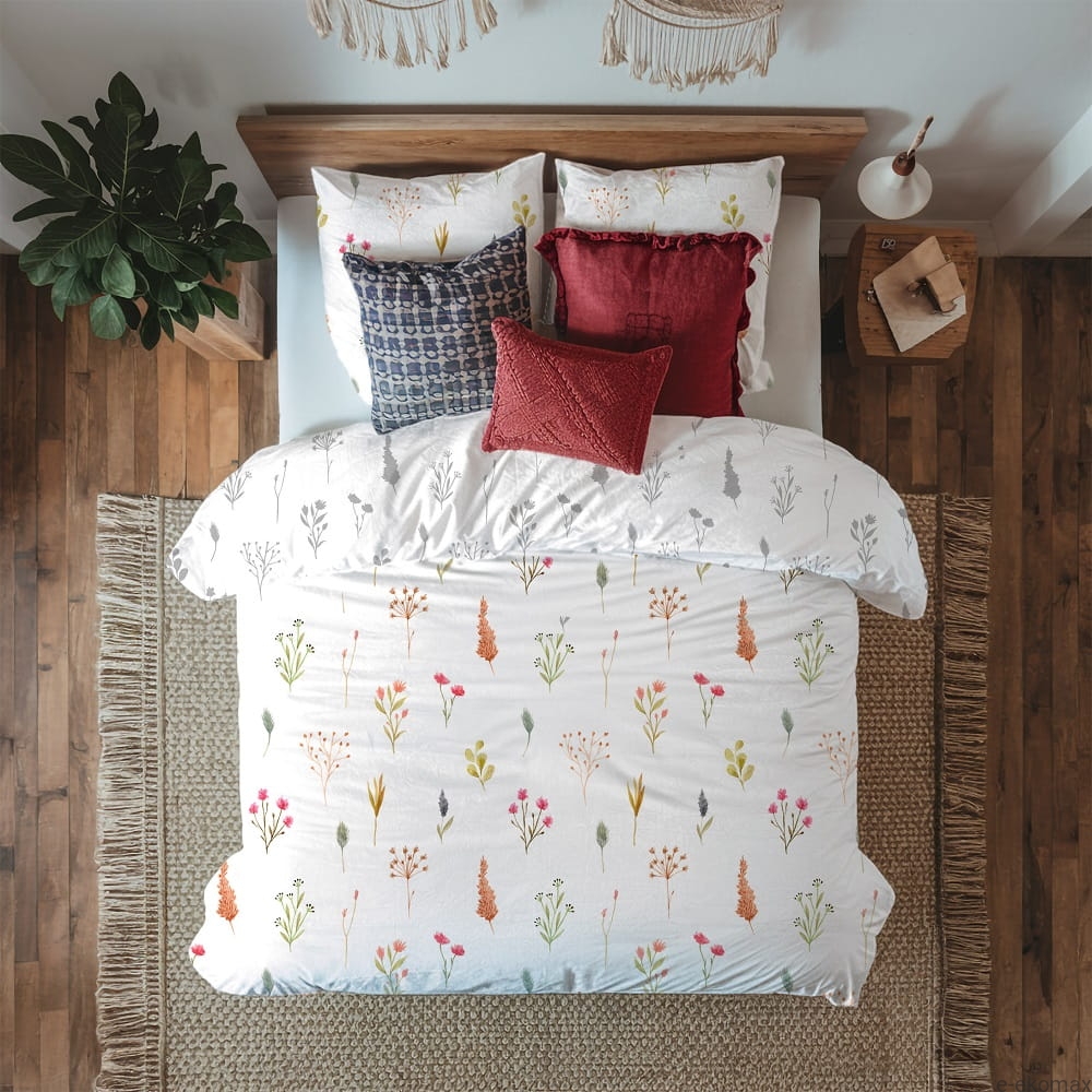 Dwustronna pościel 160x200 z satyny bawełnianej inspirowana jest subtelną łąką i naturalną prostotą. Jedna strona kompletu zdobiona została drobnym, botanicznym wzorem przedstawiającym delikatne rośliny, trawy i polne kwiaty w stonowanych odcieniach zieleni, beżu, różu oraz ciepłych tonów ziemi. Jasne tło nadaje pościeli lekkości i świeżości, doskonale rozjaśniając wnętrze sypialni.