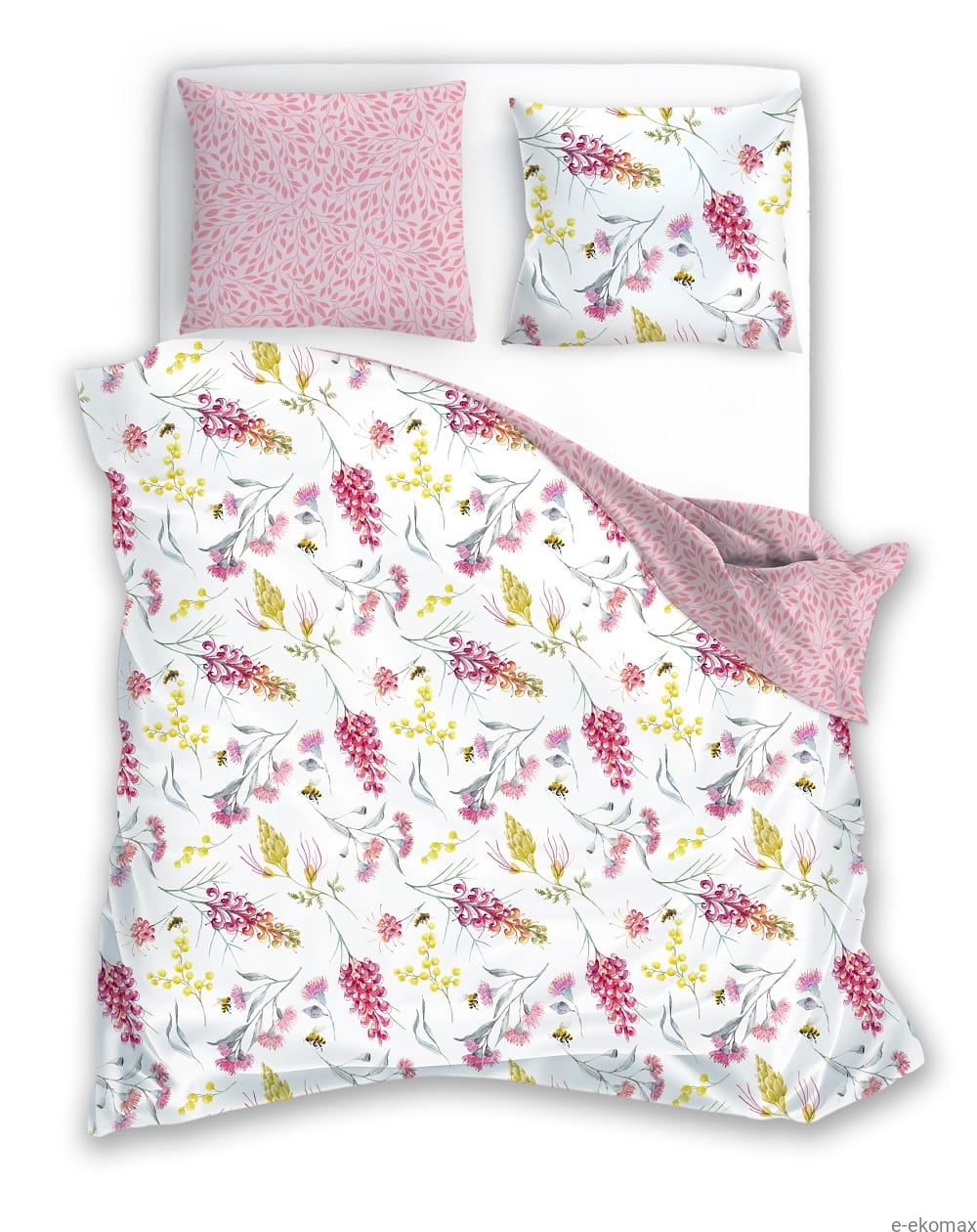 Dwustronna pościel satynowa 160x200 o lekkim, wiosennym charakterze, inspirowana naturalną florą i subtelną kolorystyką. Jedna strona zdobiona jest delikatnym, botanicznym wzorem przedstawiającym drobne kwiaty, gałązki i roślinne detale w odcieniach różu, żółci i zieleni na jasnym tle. Kompozycja jest lekka, świeża i pełna naturalnego uroku, idealna do jasnych, przytulnych sypialni. Druga strona pościeli utrzymana jest w pastelowym różu z drobnym, liściastym wzorem, który nadaje całości harmonii i pozwala na łatwą zmianę aranżacji wnętrza.
