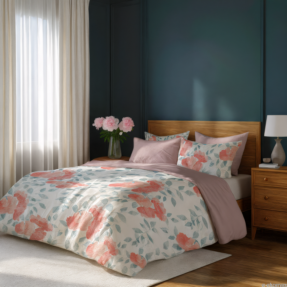 Wprowadź do swojej sypialni harmonię, elegancję i delikatną świeżość dzięki dwustronnej pościeli 160x200 z satyny bawełnianej. Jedna strona pościeli zachwyca romantycznym, kwiatowym motywem – duże, miękko rozrysowane kwiaty w odcieniach pudrowego różu i koralu zostały połączone z subtelnymi, zielonkawo-niebieskimi liśćmi na jasnym, kremowym tle. Całość tworzy lekką, przytulną i bardzo elegancką kompozycję inspirowaną naturą.