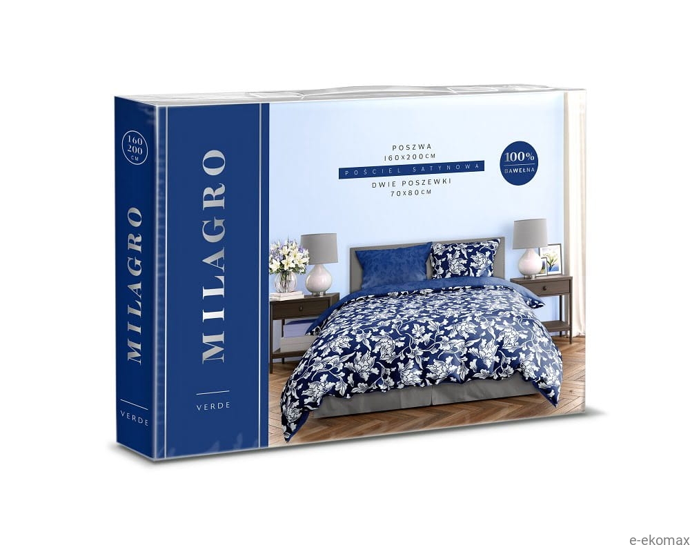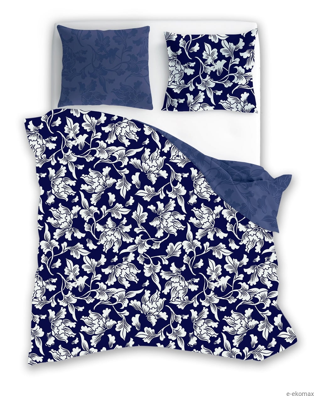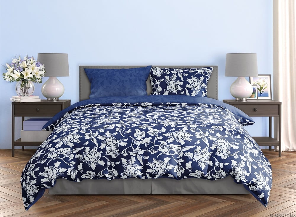 Druga strona pościeli utrzymana jest w jednolitym, stonowanym odcieniu granatu z subtelnym, tonalnym wzorem, co pozwala na łatwą zmianę aranżacji sypialni – od bardziej dekoracyjnej po spokojną i elegancką. Dwustronna forma sprawia, że pościel jest wyjątkowo praktyczna i uniwersalna.