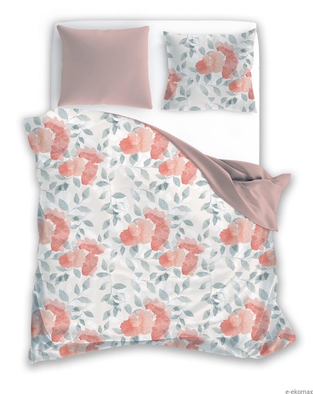 Wprowadź do swojej sypialni harmonię, elegancję i delikatną świeżość dzięki dwustronnej pościeli 220x200 z satyny bawełnianej. Jedna strona pościeli zachwyca romantycznym, kwiatowym motywem – duże, miękko rozrysowane kwiaty w odcieniach pudrowego różu i koralu zostały połączone z subtelnymi, zielonkawo-niebieskimi liśćmi na jasnym, kremowym tle. Całość tworzy lekką, przytulną i bardzo elegancką kompozycję inspirowaną naturą.