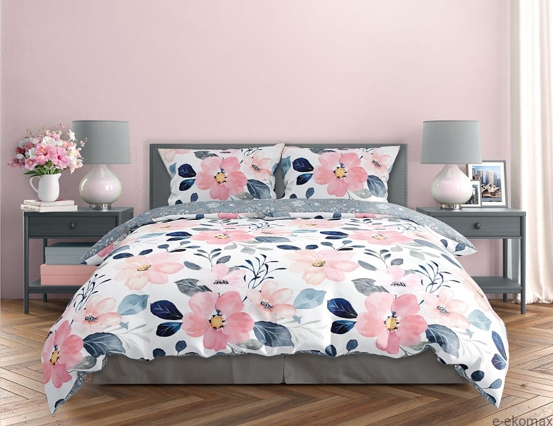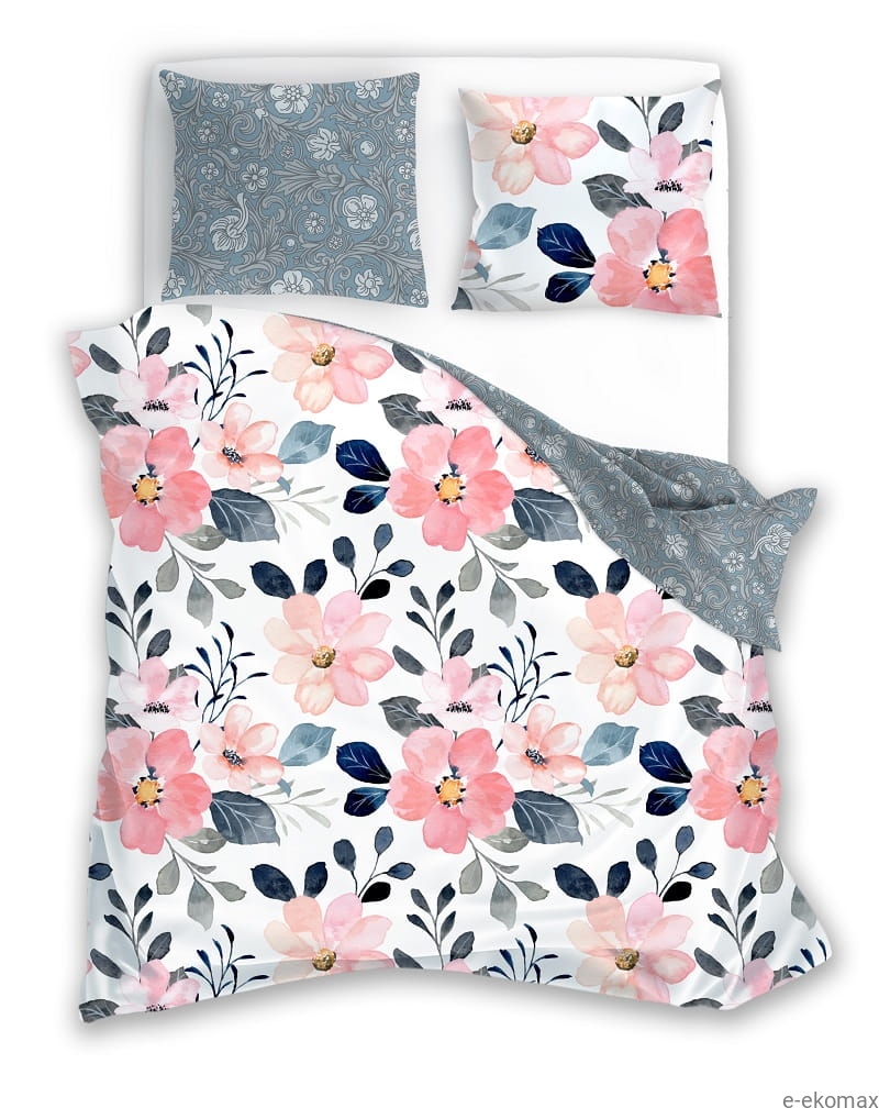 Dodaj swojej sypialni wyjątkowego uroku i świeżości dzięki pościeli Milagro Verde w rozmiarze 220x200. Ten większy komplet pościeli z satyny bawełnianej to idealne rozwiązanie dla par oraz osób ceniących przestrzeń i wygodę podczas snu. Z jednej strony pościel zdobi uroczy, kwiatowy wzór w stylu akwareli – różowe i brzoskwiniowe kwiaty na białym tle otulone granatowymi i szarymi liśćmi tworzą pełną wdzięku, harmonijną kompozycję. Druga strona to elegancki wzór w stonowanym niebiesko-szarym odcieniu, nawiązujący do klasycznych ornamentów roślinnych.