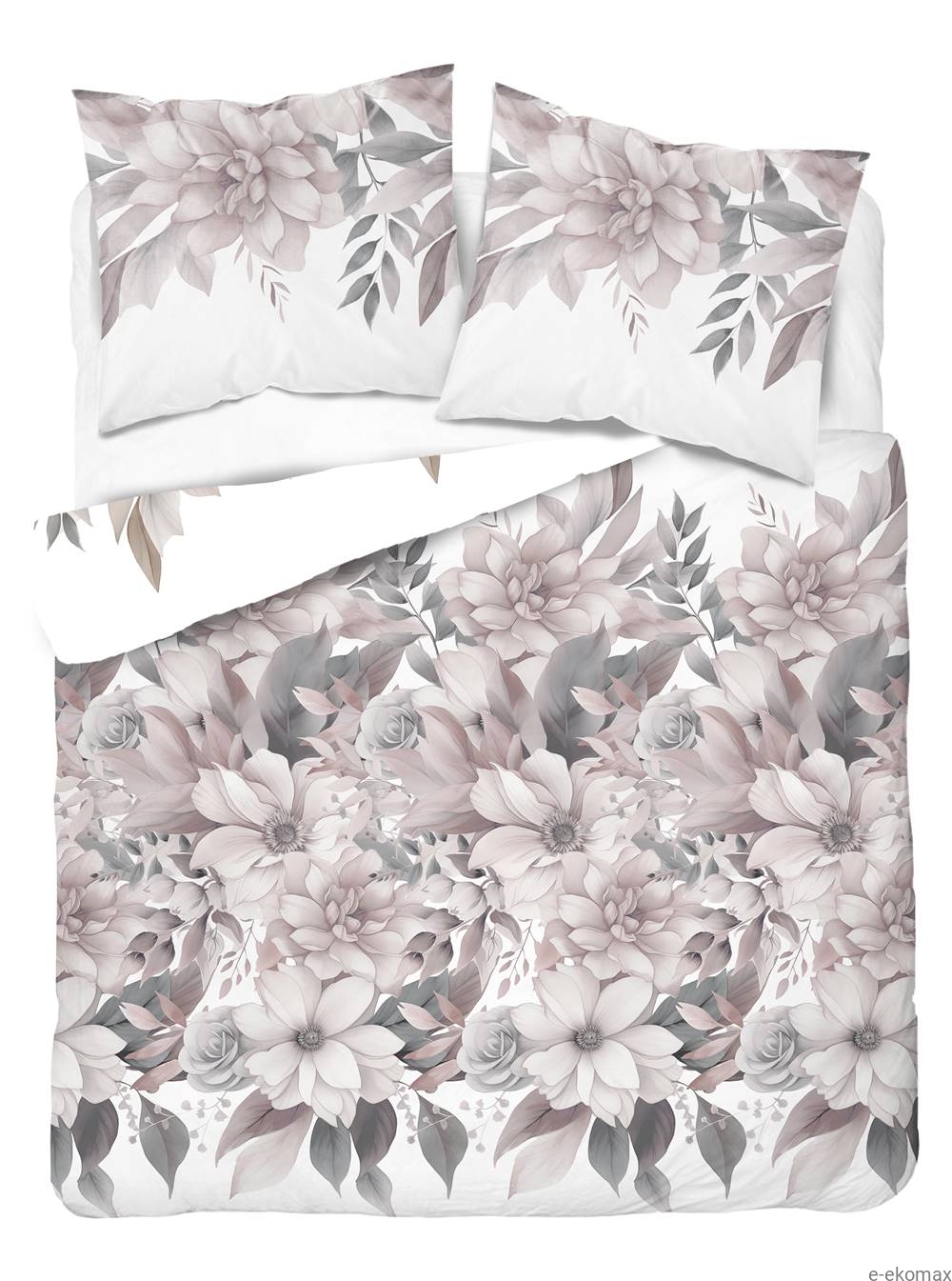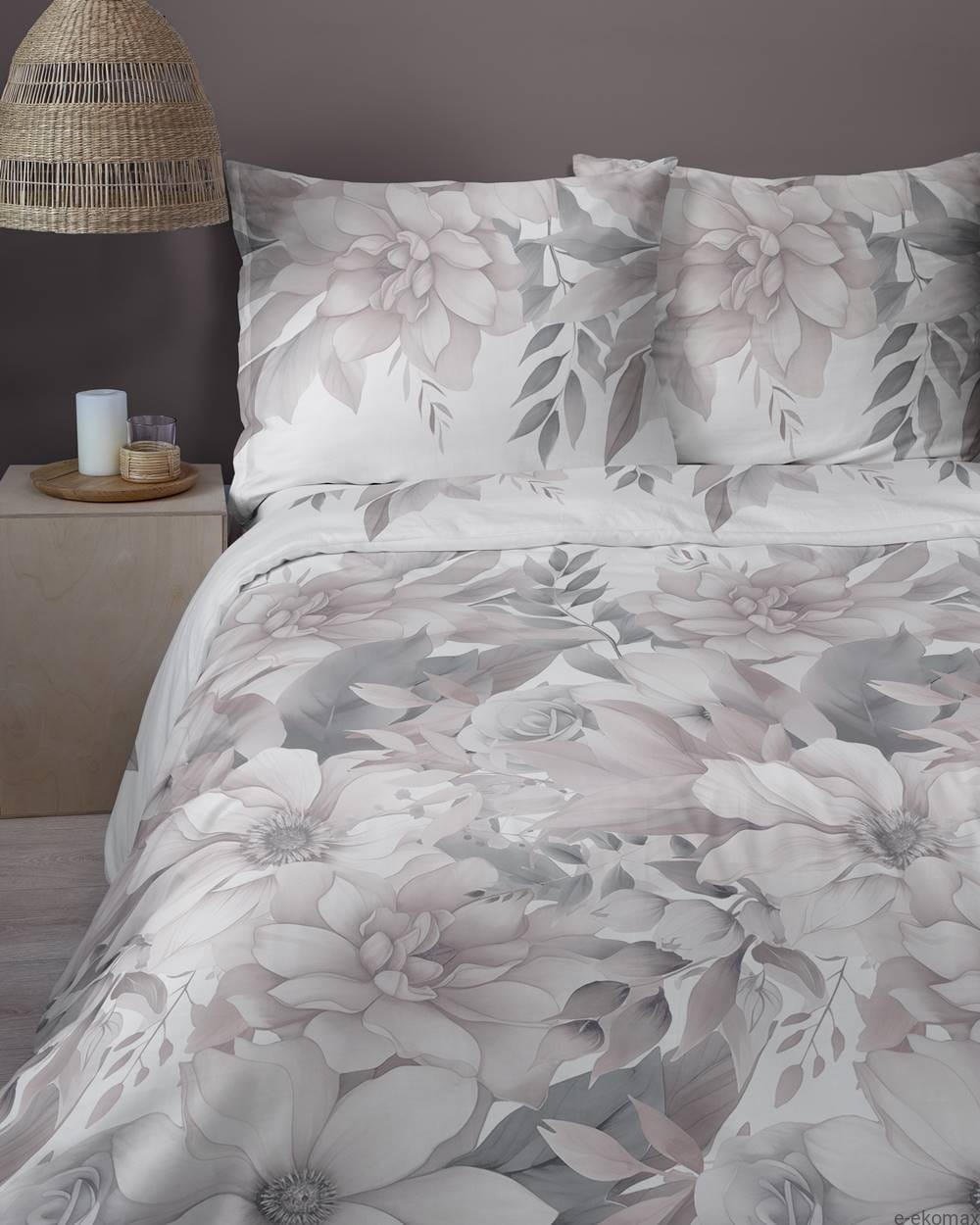 Motyw pudrowych kwiatów na białym tle tworzy harmonijną kompozycję, która nadaje pościeli lekkości i delikatności. Kwiaty dodają sypialni przytulności i elegancji, tworząc atmosferę spokoju i relaksu.