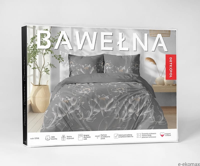 Pościel bawełniana 100% szara 180x200 kwiaty lotosu