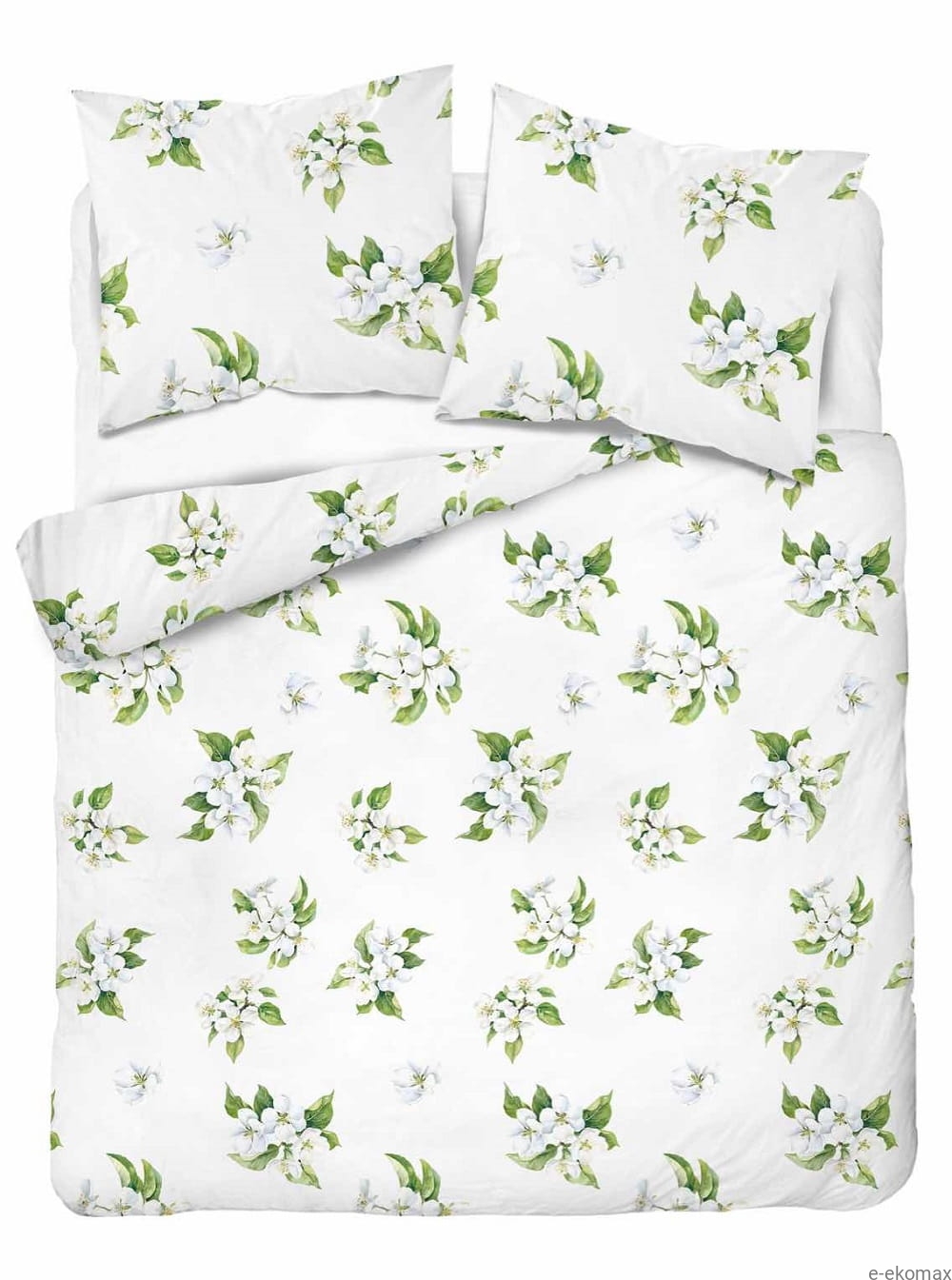 Wprowadź do swojej sypialni atmosferę lekkości i naturalnej harmonii z pościelą bawełnianą 220x200 w delikatny, kwiatowy wzór. Subtelne, białe kwiaty otoczone zielonymi liśćmi na śnieżnobiałym tle tworzą kompozycję pełną świeżości i wdzięku. Motyw inspirowany naturą wprowadza do wnętrza spokój i przyjemne, letnie wibracje, idealne do relaksu po długim dniu.