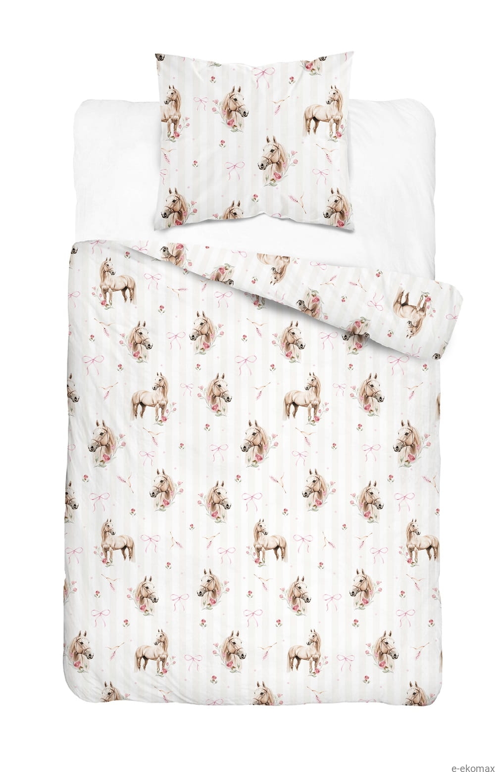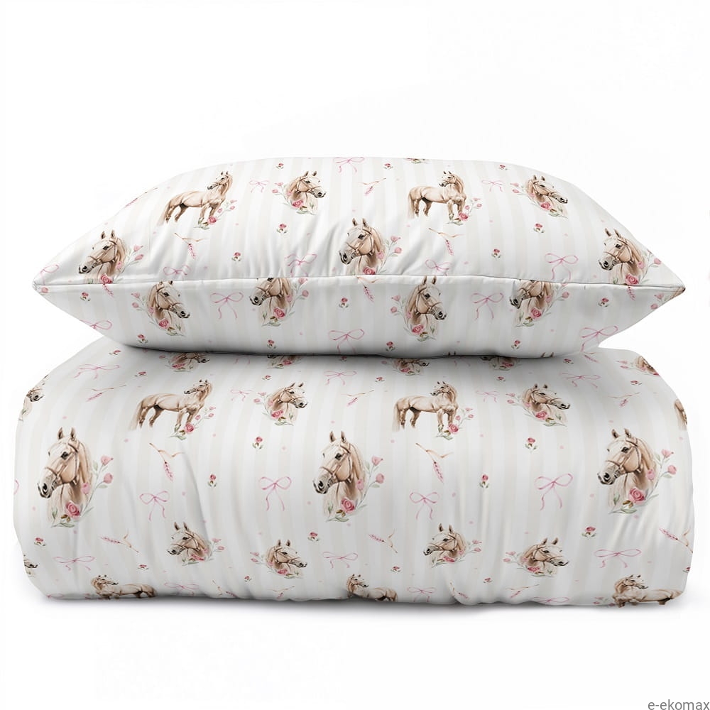Wyjątkowy komplet pościeli dziecięcej 140x200 z motywem koni to doskonały wybór dla miłośniczek jazdy konnej i subtelnych, dziewczęcych wzorów. Delikatne ilustracje koni w otoczeniu różowych kokardek oraz kwiatów zostały rozmieszczone na jasnym tle w dyskretne paski, co nadaje całości lekkości i eleganckiego charakteru. Taki wzór tworzy przytulną, spokojną atmosferę w pokoju dziecka i pięknie komponuje się z jasnymi meblami oraz pastelowymi dodatkami.