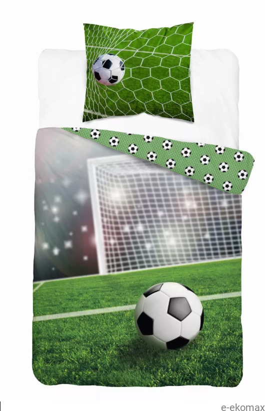 Komplet pościeli dziecięcej 140x200 z motywem piłki nożnej to idealna propozycja dla małych sportowców i fanów futbolu. Efektowny nadruk przedstawiający piłkę zmierzającą do bramki na tle zielonej murawy stadionu tworzy dynamiczną, sportową atmosferę, która pobudza wyobraźnię i zachęca do aktywności. Taki wzór sprawia, że pokój dziecka zamienia się w prawdziwe piłkarskie boisko.
