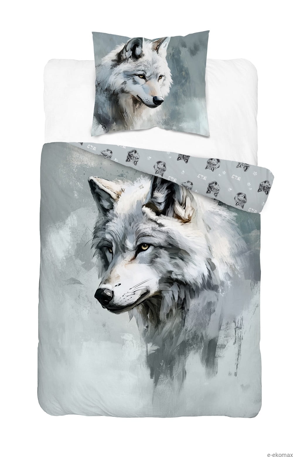 Pościel 140x200 z wilkiem posiada dwustronny wzór. Jedna strona przedstawia duży, dominujący wizerunek wilka na subtelnym, lekko rozmytym tle, natomiast druga ozdobiona jest mniejszym, powtarzalnym motywem głów wilka na jasnoszarym tle. Dzięki temu komplet można odwracać, zmieniając wygląd łóżka i dopasowując aranżację do własnych upodobań.