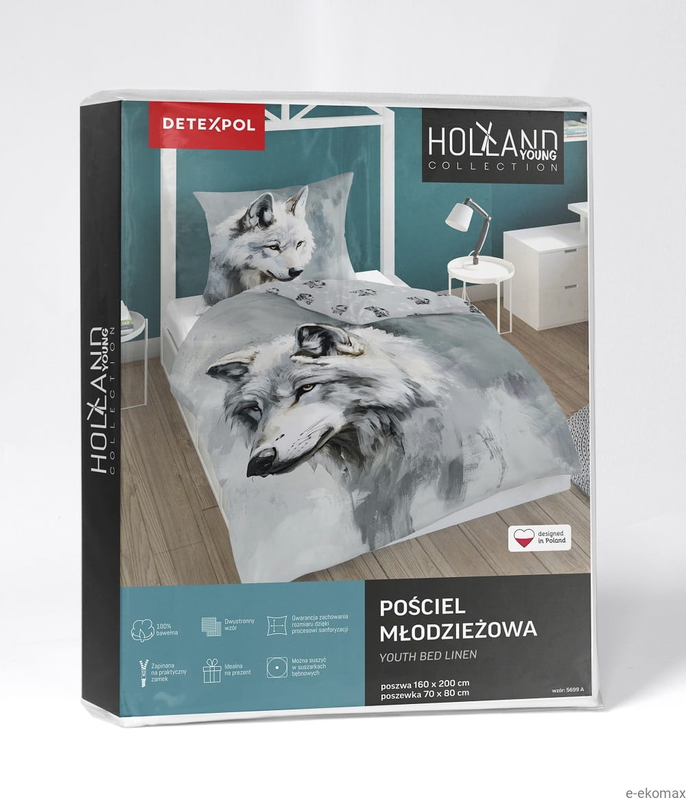 W skład kompletu wchodzi poszwa na kołdrę 140x200 cm oraz poszewka na poduszkę 70x80 cm, obie zapinane na praktyczny zamek błyskawiczny. To bawełniana pościel młodzieżowa 140x200 z motywem wilka, która łączy nowoczesny design, funkcjonalność i wysoką jakość wykonania – idealna do pokoju nastolatka.