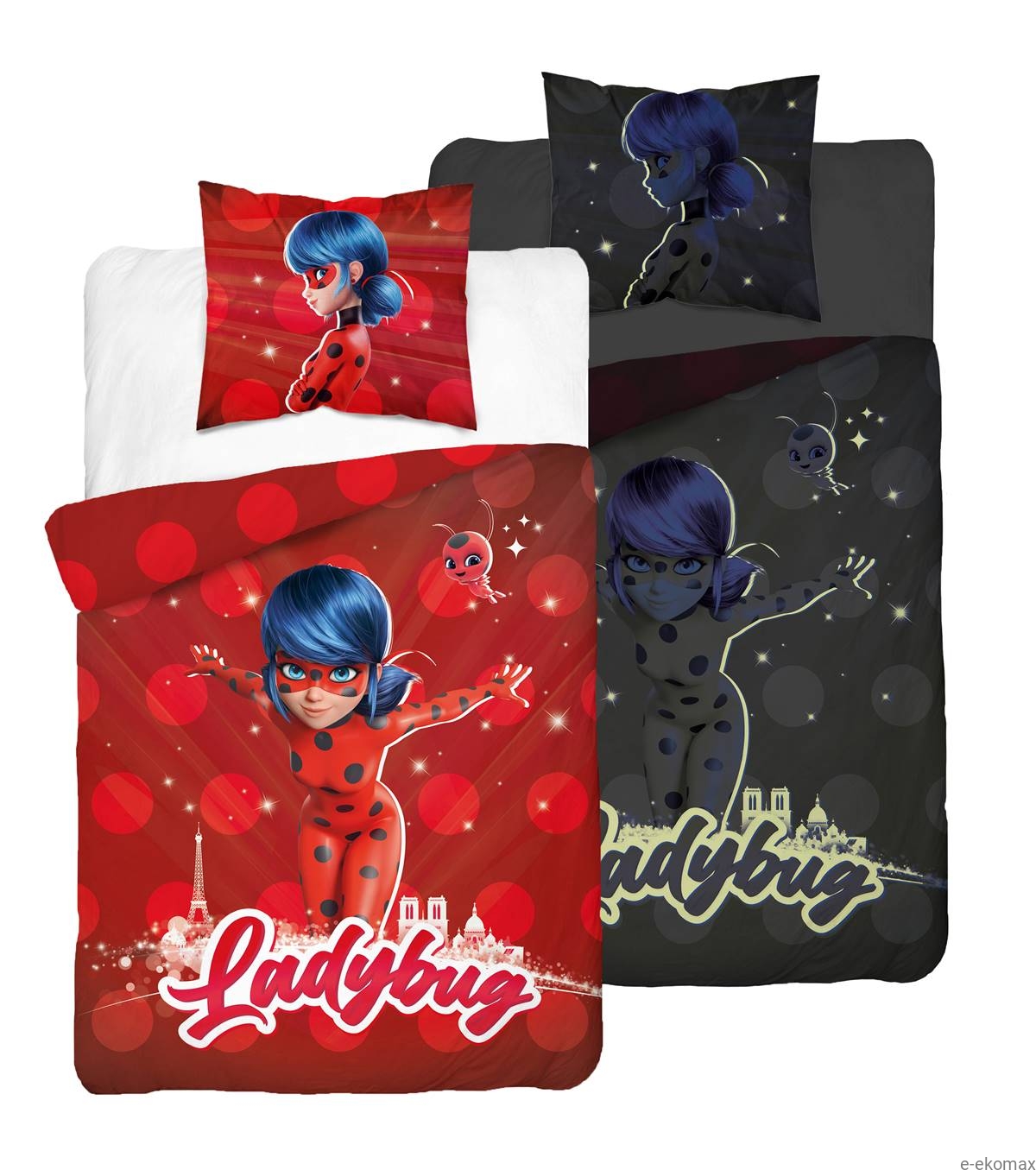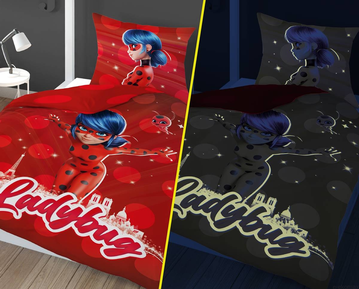 Pościel świecąca w ciemności z bohaterką Ladybug w rozmiarze 140x200 to wyjątkowy komplet stworzony z myślą o najmłodszych fanach przygód Biedronki. Intensywna kolorystyka z dominującą czerwienią oraz energiczny nadruk postaci Ladybug tworzą dynamiczną kompozycję, która ożywi każdą dziecięcą sypialnię. To, co wyróżnia tę pościel, to fluorescencyjny efekt – wzór świeci subtelnie w ciemności, zapewniając dzieciom magiczną atmosferę przed snem.
