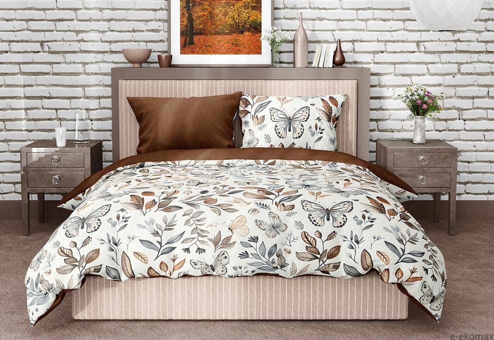 Wyjątkowy wzór z motywem motyli i roślinnych ornamentów w ciepłej, naturalnej kolorystyce nadaje sypialni lekkości, świeżości i harmonijnego charakteru. Delikatne beże, brązy i subtelne kontrasty doskonale wpisują się w aranżacje boho, naturalne, klasyczne oraz nowoczesne.